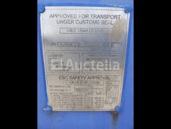 45 voet zeildoek zeecontainer Merk: Yangzhou Model: TL-45CKL Jaar: 2007 Lengte: 1371 cm Breedte: 255 cm Hoogte: 2900 cm Leeggewicht: 5870 kg Status: Functioneel op Inventarisatiedag Niet inbegrepen: De inhoud Opmerkingen: Aanbevolen bezoek