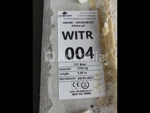 Betonplaten Merk: LG-beton Model: T17 bree Jaar: 2012 Lengte: 499 cm Breedte: 20 cm Hoogte: 269 cm Leeggewicht: 4706 kg Aantal: 7 Hergebruikte betonplaten Opmerkingen: Aanbevolen bezoek
