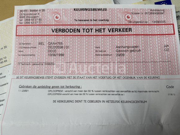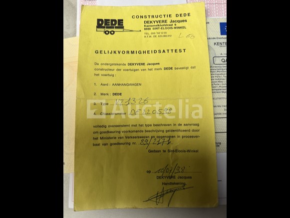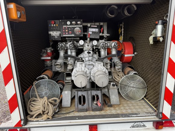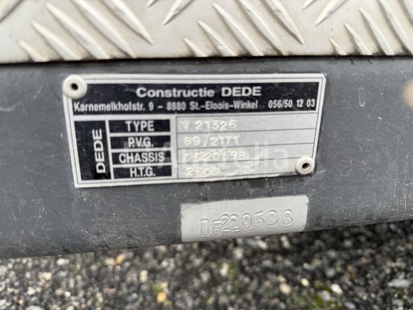 Aard : aanhangwagen, 2 as, gesloten Merk: DEDE Model: VE1326 Chassis: DE 220 598 1e inschrijving: 10-06-1998 HTG : 2600 kg UITRUSTING : - 6-cylinder dieselmotor IVECO AIRO - waterpomp, merk ZIEGLER - debiet 10 bar - stand-by lader, brandsclangen, touwen, e.a. - met alu materiaalkoffer Documenten: OK Sleutel(s): niet van toepassing