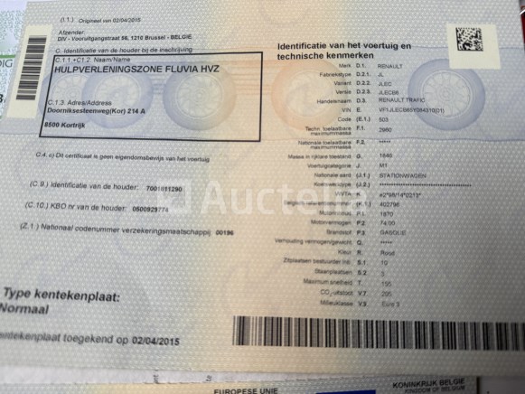 Aard : stationwagen Merk: RENAULT Model: TraficCombi L2H1 290 CI / 1,9 dCi 100 Chassis: VF1 JLE CB6 57 084 310 1e inschrijving: 28-02-2005 km op teller : 74.053 op teller motor : 1870 cm³ - 74 kW - gasolie - euro 3 HTG : kg UITRUSTING : bagagedrager, trekhaak, zijschuifdeur, manuele versnellingen, 2+ 1 zitplaatsen voor en 3 zitplaatsen achter, ingericht als bureel HTG : 2900 kg Documenten: OK Sleutel(s): 1 Opmerking : Verkoper wijst koper erop dat de signalisatielichten, voorbehouden aan brandweer- en hulpdiensten, niet door particulieren of erkende bedrijven op de openbare weg mogen worden gebruikt en daarom vóór ingebruikname van het voertuig moeten worden verwijderd/gemonteerd.