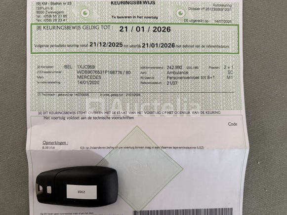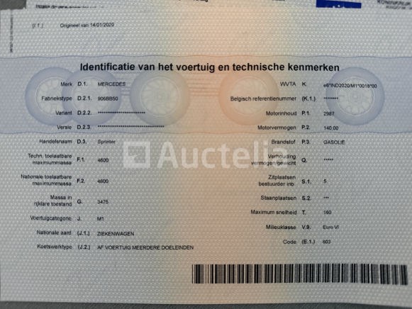Aard : ziekenwagen Merk: MERCEDES Model: Sprinter 906 BB 50 Chassis: WDB 907 653 1P 156 776 1e inschrijving: 14-01-2020 km : 242.992 op teller bij de laatste keuring op 14/7/25 motor : 2987 cm³ | 140 kW | diesel | euro VI BELANGRIJK : motor stuk - voertuig start en rijdt niet (te takelen) !!! HTG : kg UITRUSTING : inrichting voor ambulance - ziekentransport AUTOGRAPHE - personenvervoer tot 8+1 | dubbele achterwielen HTG = 4600 kg Documenten: OK Sleutel(s): 3 OPMERKING : Verkoper wijst koper erop dat de blauwe signalisatielichten, voorbehouden aan brandweer- en hulpdiensten, niet door particulieren of erkende bedrijven op de openbare weg mogen worden gebruikt en daarom vóór ingebruikname van het voertuig moeten worden verwijderd/gemonteerd.