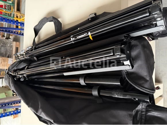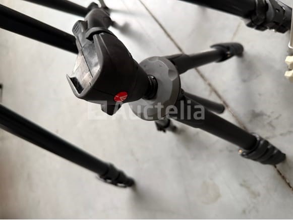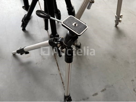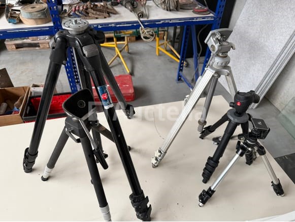 5 diverse in de hoogte verstelbare driepikkelstatieven, oa. MANFRETTO + draagtas met een set framehouder