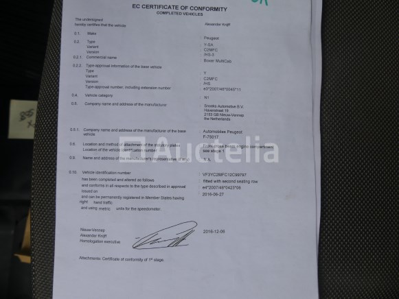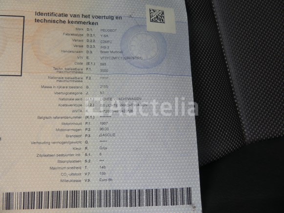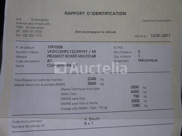 Pick-up truck Merk: Peugeot Model: Boxer multicab Jaar: 2016 Kilometerstand: 150527 Lengte: 600 cm Breedte: 205 cm Hoogte: 252 cm Vermogen: 96 kW Datum van eerste inschrijving: 13-12-16 Brandstof: Diesel Verplaatsing (cc): 1997 Versnellingsbak: Handgeschakeld MMA: 3500 kg Eigengewicht: 2340 kg Wielbasis: 403 cm Ophanging: Mechanisch Airconditioning: Handmatig Radio: Ja Achteruitrijdende radar: Ja Aantal toetsen: 1 Aantal zetels: 6 Certificaat van conformiteit: Ja Technisch keuringscertificaat: Ja Technisch keuringscertificaat geldig tot: 26-12-12 Registratiecertificaat Deel 1: Ja Registratiecertificaat Deel 2: Te controleren Identificatierapport: Ja Voertuig nog in gebruik (kilometerstand verandert): Nee Chassisnummer: VF3YC2MFC12C99797 Eurostandaard: 6b Status: Op de dag van inventarisatie beginnen Notities: Aanbevolen bezoek Het voertuig is tijdens de inventarisatie niet grondig geïnspecteerd en kan niet-zichtbare defecten hebben. De koper zou het perceel vóór de aankoop hebben bezocht om eventuele afhandeling voor de incasso van zijn perceel te plannen