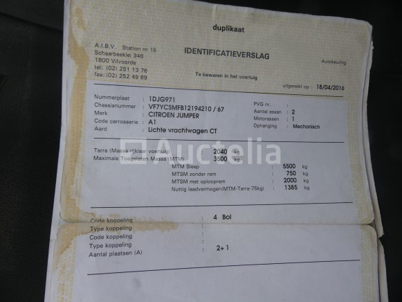 Pick-up truck Merk: Citroën Model: Jumper Jaar: 2012 Kilometerstand: 77640 Lengte: 541 cm Breedte: 205 cm Hoogte: 252 cm Vermogen: 81 kW Datum van eerste inschrijving: 01-06-12 Brandstof: Diesel Verplaatsing (cc): 2198 Versnellingsbak: Handgeschakeld MMA: 3500 kg Taregewicht: 2040 kg Wielbasis: 345 cm Ophanging: Mechanisch Airconditioning: Handmatig Radio: Ja Achteruitrijdende radar: Ja Aantal toetsen: 1 Aantal zetels: 3 Certificaat van conformiteit: Ja Technisch keuringscertificaat: Ja Technisch keuringscertificaat geldig tot: 18-06-26 Registratiecertificaat Deel 1: Ja Identificatierapport: Ja Voertuig nog in gebruik (kilometerstand verandert): Nee Chassisnummer: VF7YCSMFB12194210 Eurostandaard: 5 Status: Op de dag van inventarisatie beginnen Notities: Aanbevolen bezoek Het voertuig is tijdens de inventarisatie niet grondig geïnspecteerd en kan niet-zichtbare defecten hebben. De koper zou het perceel vóór de aankoop hebben bezocht om eventuele afhandeling voor de incasso van zijn perceel te plannen