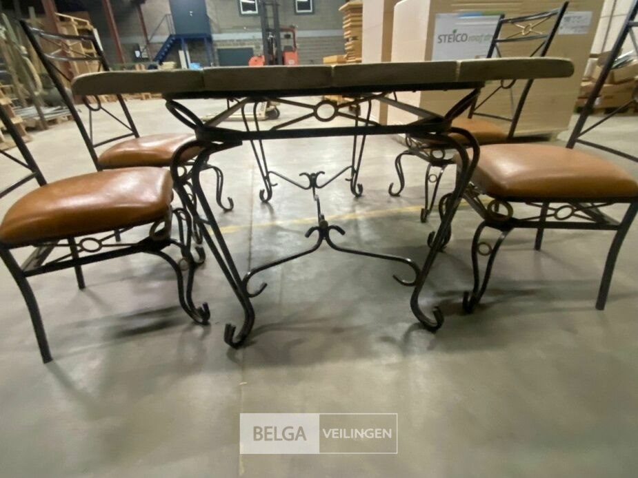 Eettafel met 4 stoelen rustiek houten tablet ijzer sier onderstel 150 x 88cm