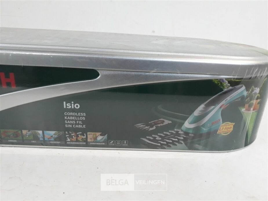 1 x buxusschaar 12 cm isio 3,6v + vervangmes als grasschaar in blikken opbergdoos