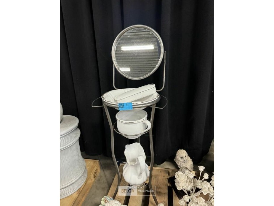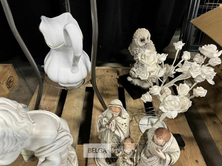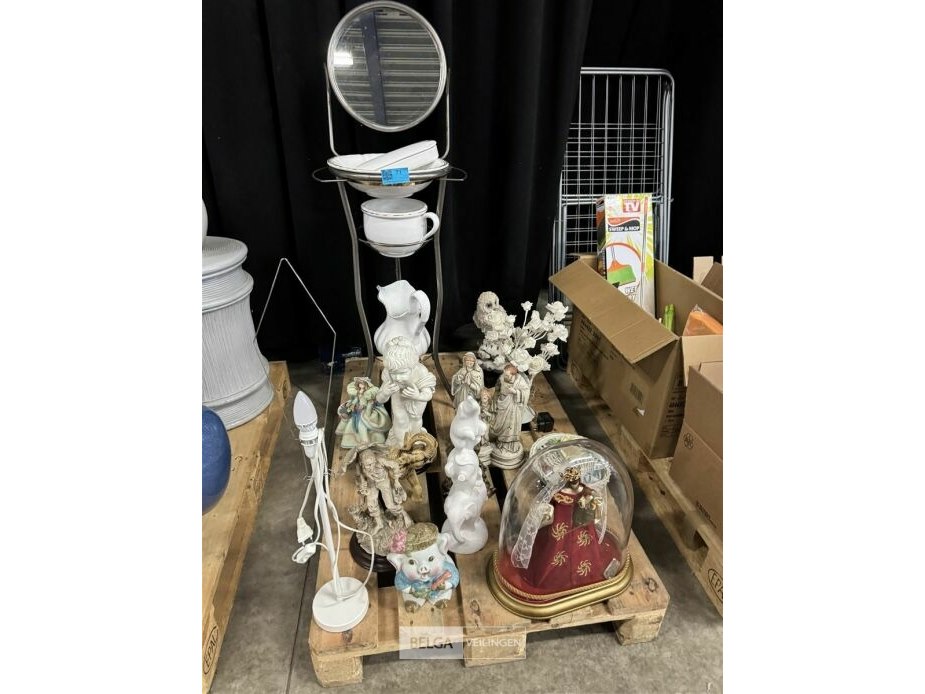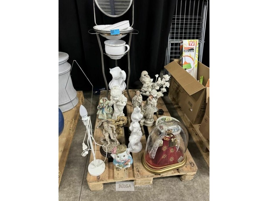 Pallet met beelden + potten + staander met spiegel