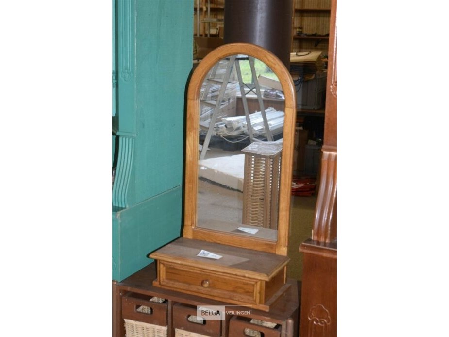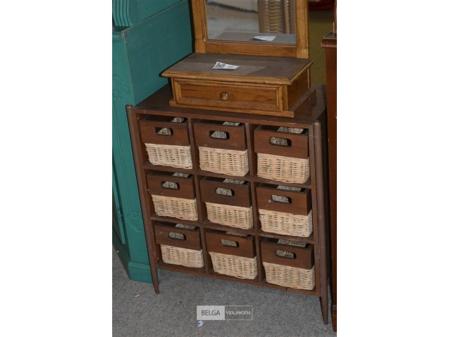 1 houten kastje met rieten mandjes en 1 houten kaptafel met halfronde spiegel en lade