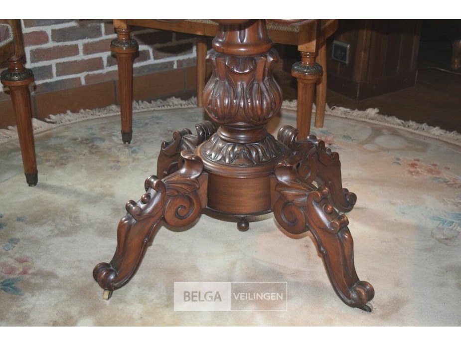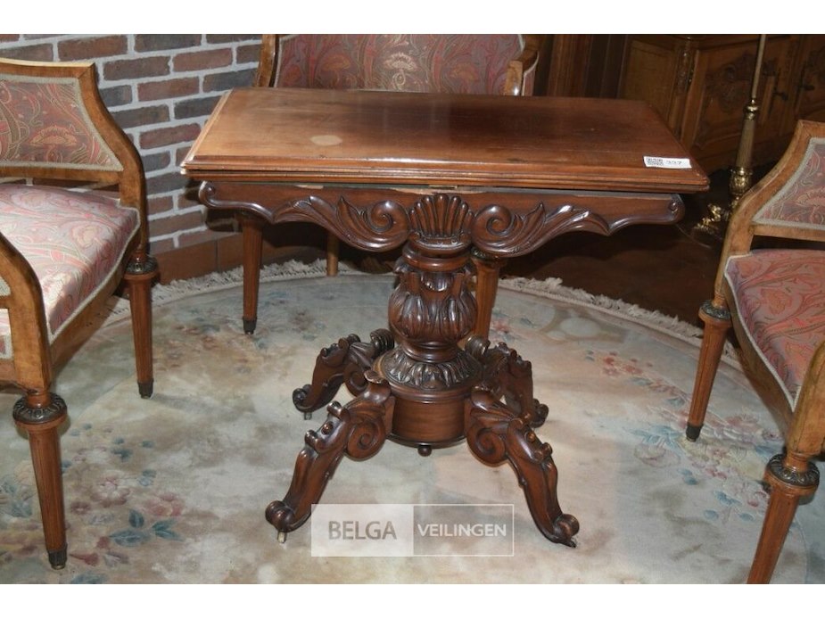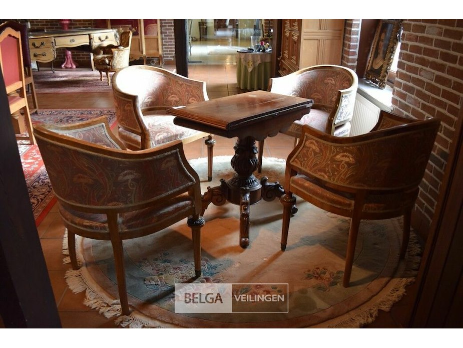 Vintage speeltafel met 4 fauteuils met gebogen rugleunig + tapijt