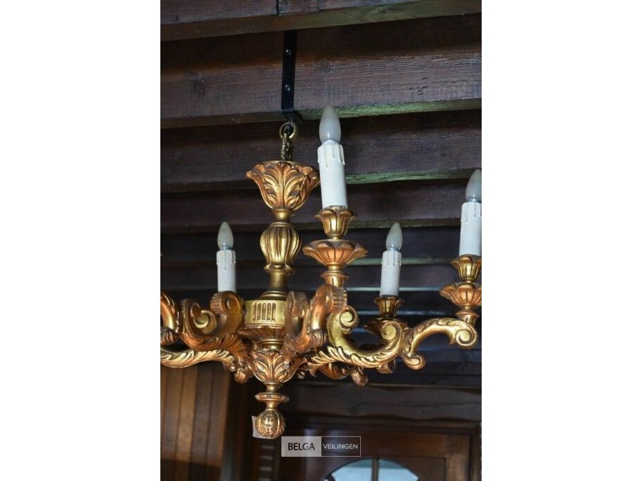 6-armige kroonluchter uit hout goud geschilderd