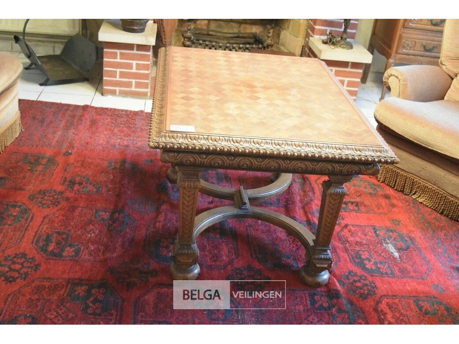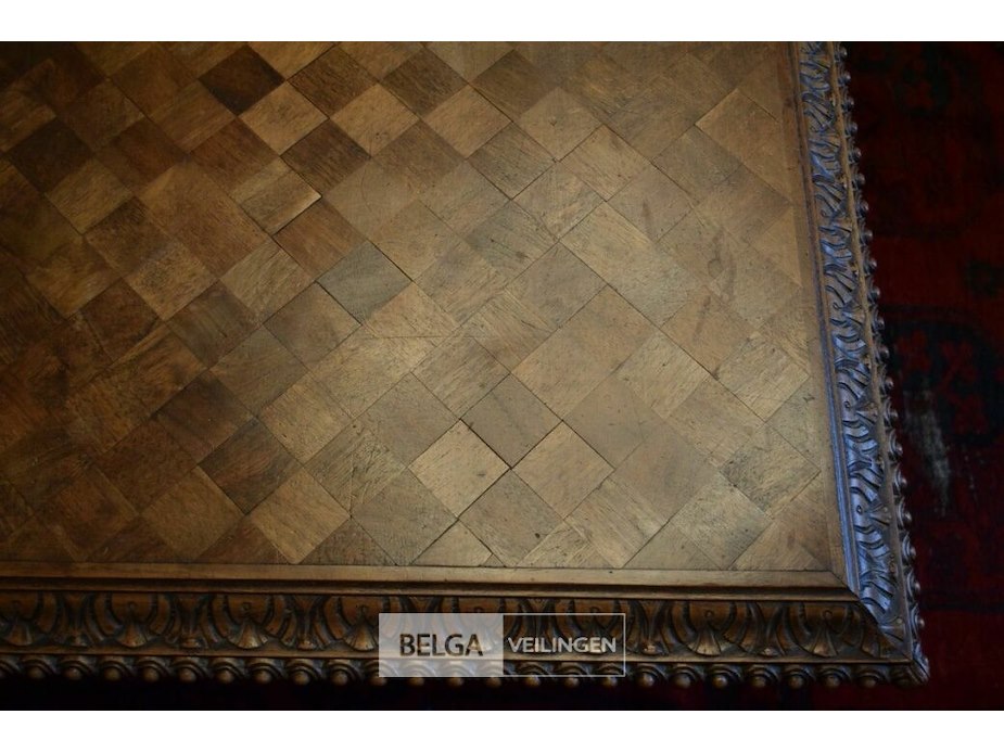 Antieke houten tafel met een ingelegd patroon en sierlijke poten