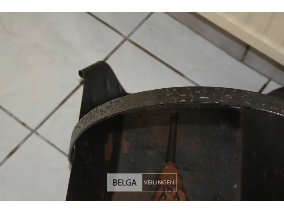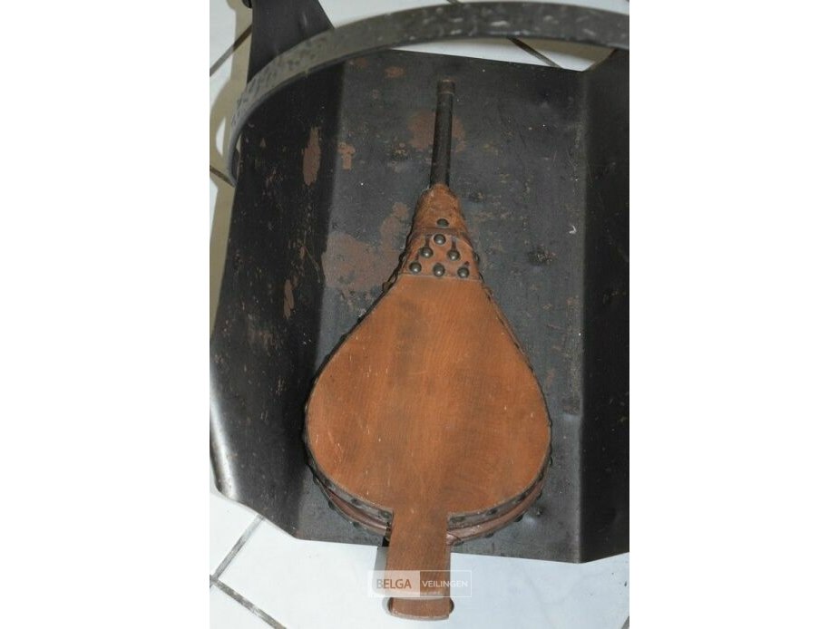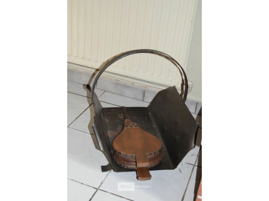 Vintage metalen haardhoutbak met een antieke houten haardblazer