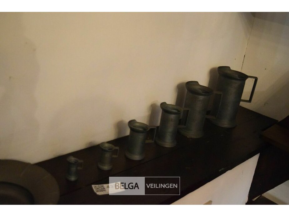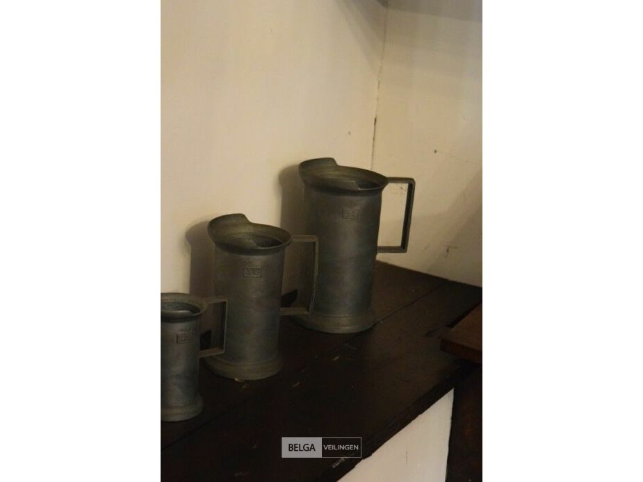 6x tinnen maatbekers + schotel