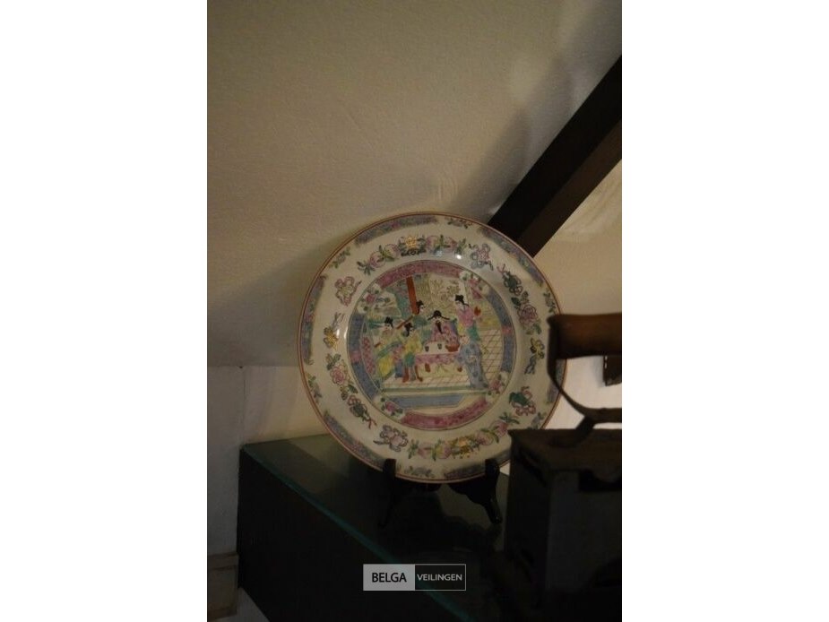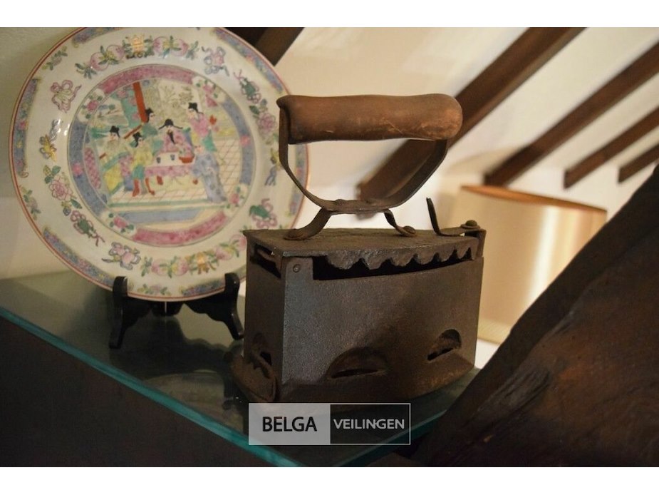 Antiek kolenstrijkijzer en chinees bord