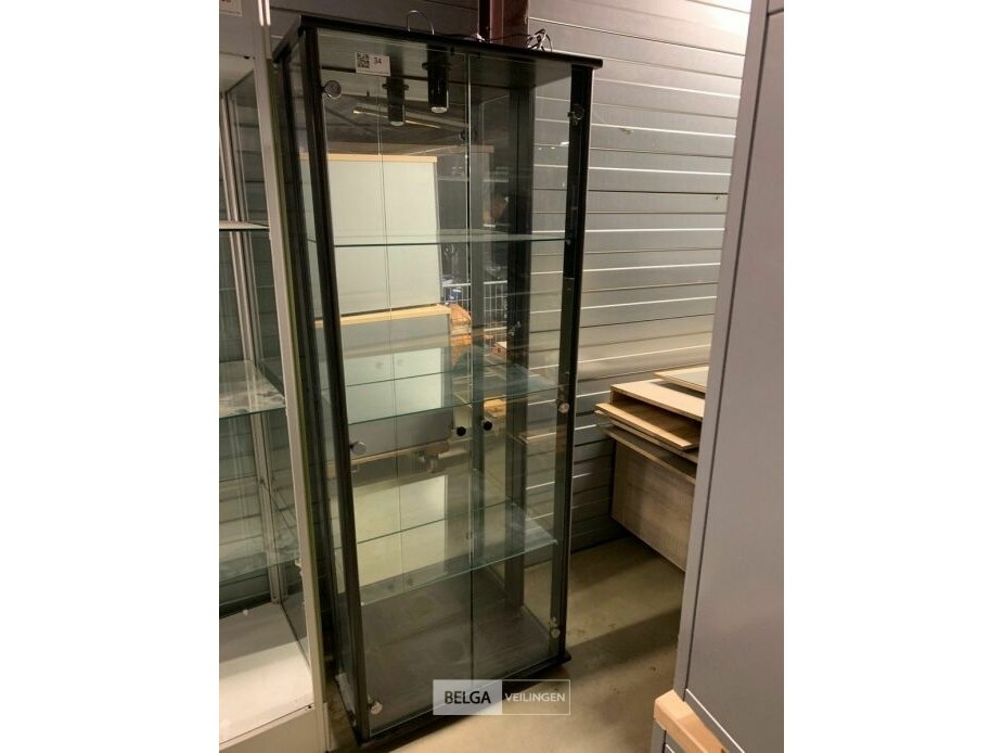 Glazen vitrinekast met deuren en glazen leggers en verlichting