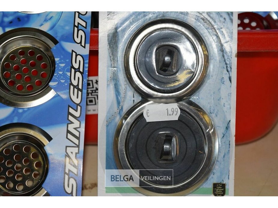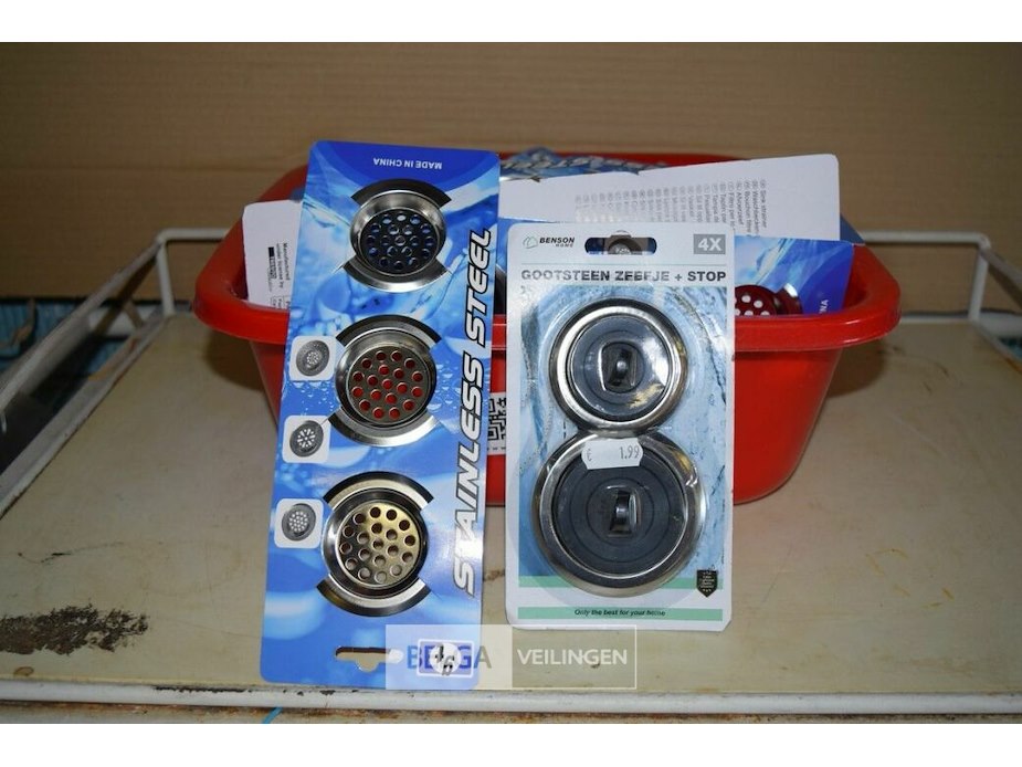 Inhoud bak partij div. gootsteenzeefjes + stop