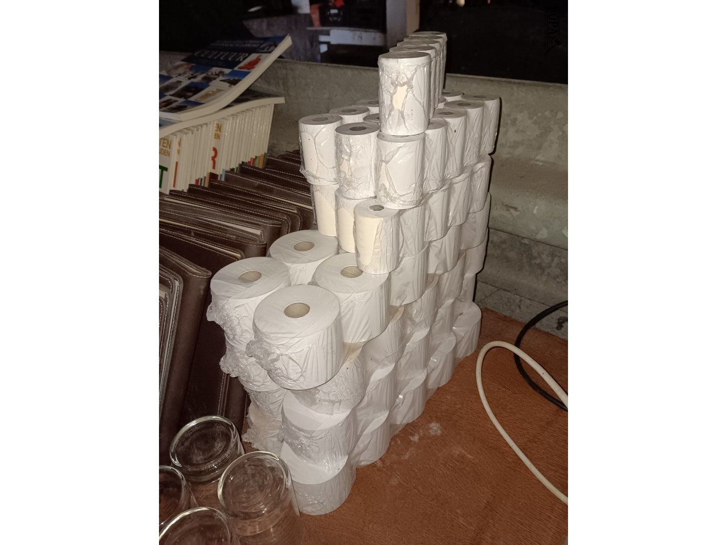 Lot nieuwe menuboeken, diverse glaasjes en kassarollen