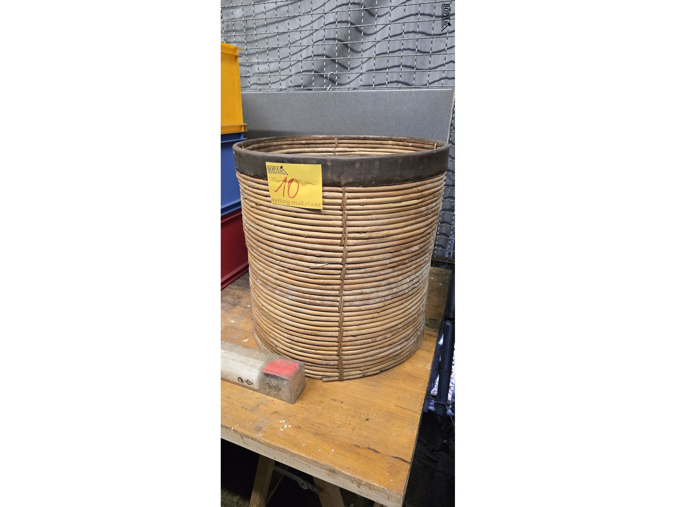 Ton in bamboe met koperen rand, diameter 46 cm, Hoogte 47 cm
