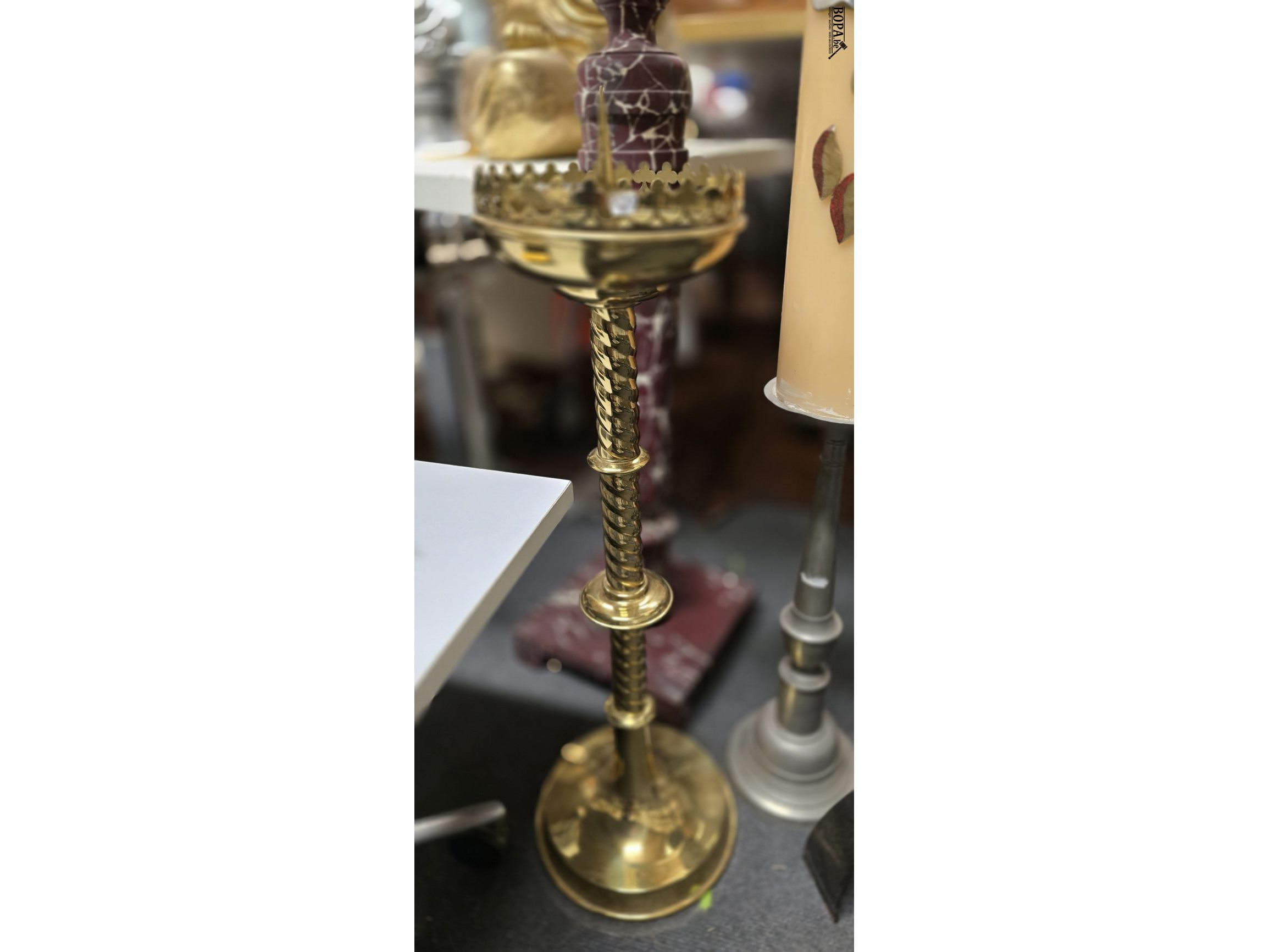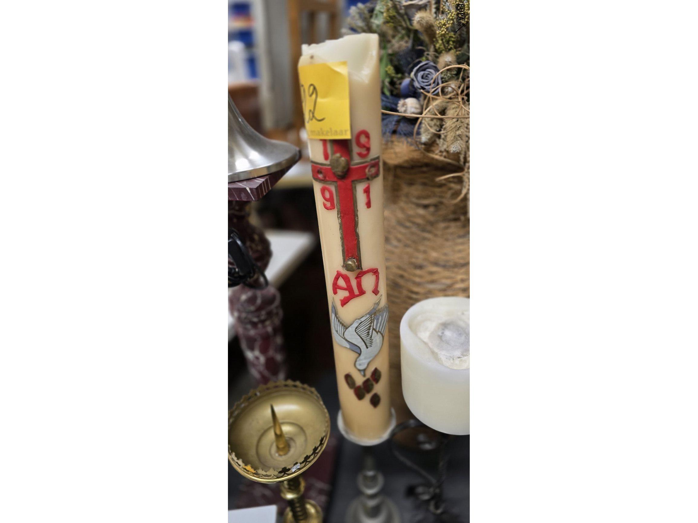 Grote kandelaars met kaarsen 3 stuks, 1 tinnen kandelaar met paaskaars h ong 109 cm + een metalen kandelaar met kaars H ong 70 cm + koperen kandelaar zonder kaars H ong 60 cm