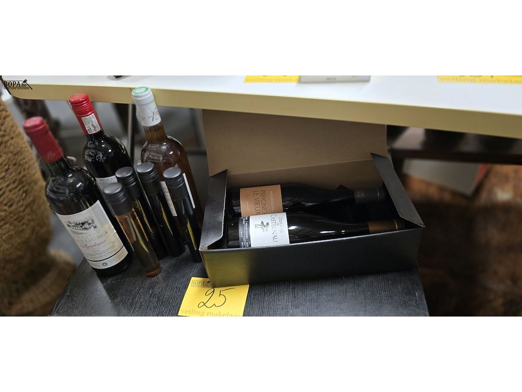 Lot wijn flessen en tubes 9 stuks Doos met fles domain de Castelnau rood 2023 en Mourvedre Preignes le Vieux rood 2023 Fles witte wijn Chateau Montgailland bordeaux 2012 Fles rode wijn Chateau Haut Garriga Bordeaux 2016 Fles Oude kaap vintage 2023 Bottled in South Africa Tube Donati negroamaro merlot Italia Tube Fox Gros Shinez Cabenet Sauvignon Australia Tube Calvet Reserre Merlot Cabenet Sauvignon Bordeaux Tube witte wijn Domain La serre picpoul de Pinet Lanquedoc