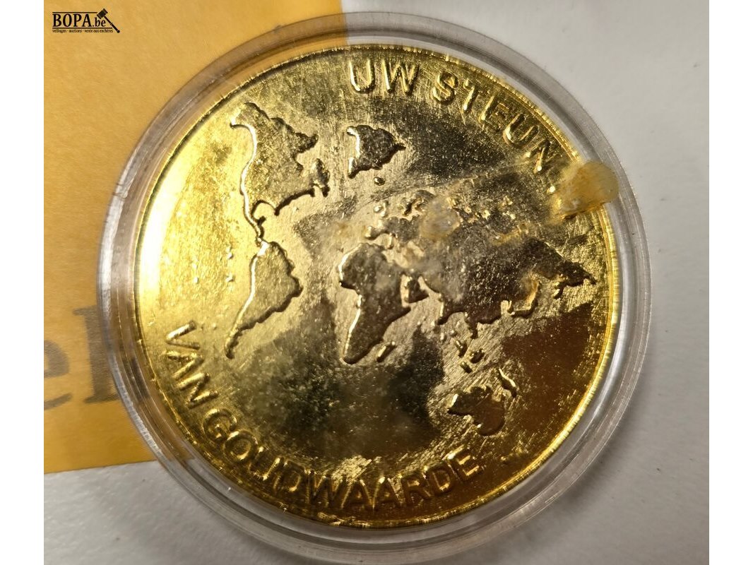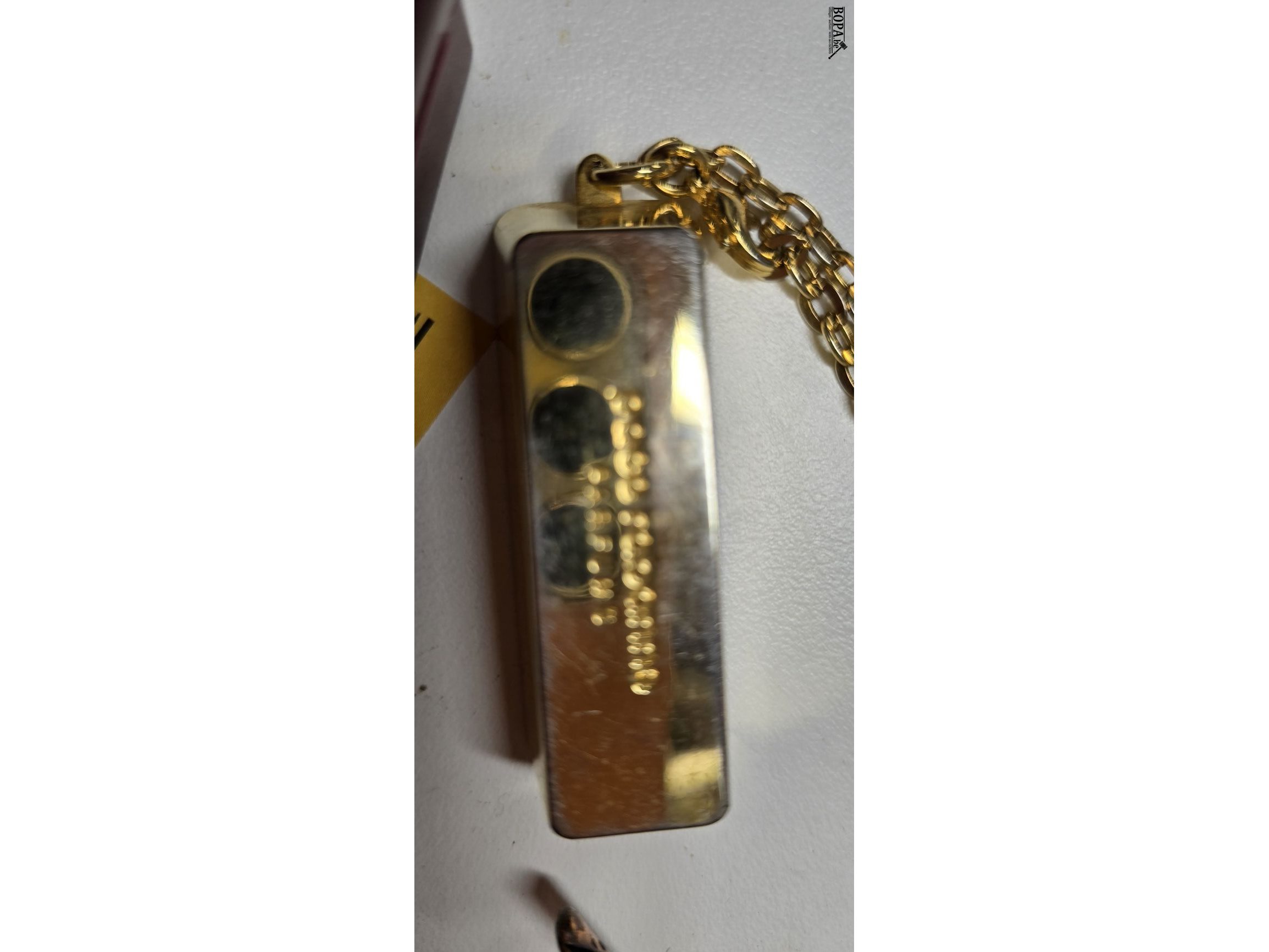 Diverse (vergulde) items 5 stuks, klein namaak goudstaaf met tekst Paco rabanne parfums, vergulde armband, vliegtuigbroche curedon collection, vergulde ring met steentjes en medaillon help child