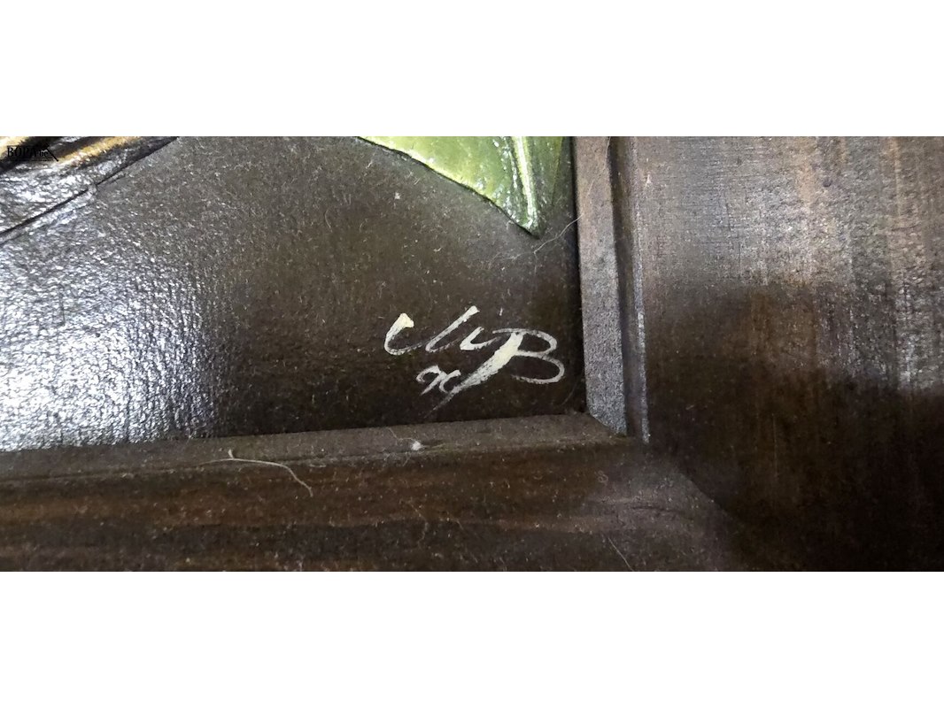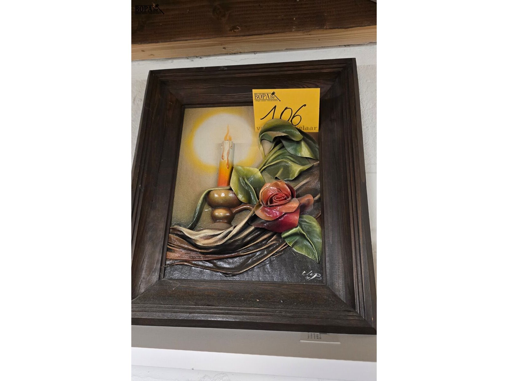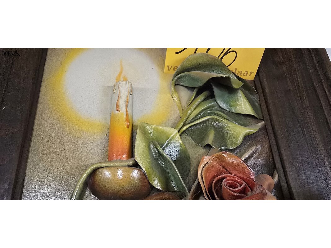 Lot 106 - kader met 3 d kaars en bloemen in leder