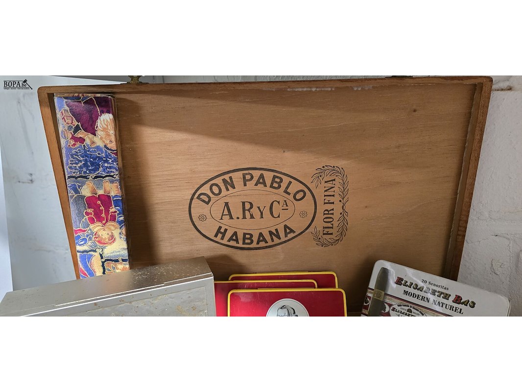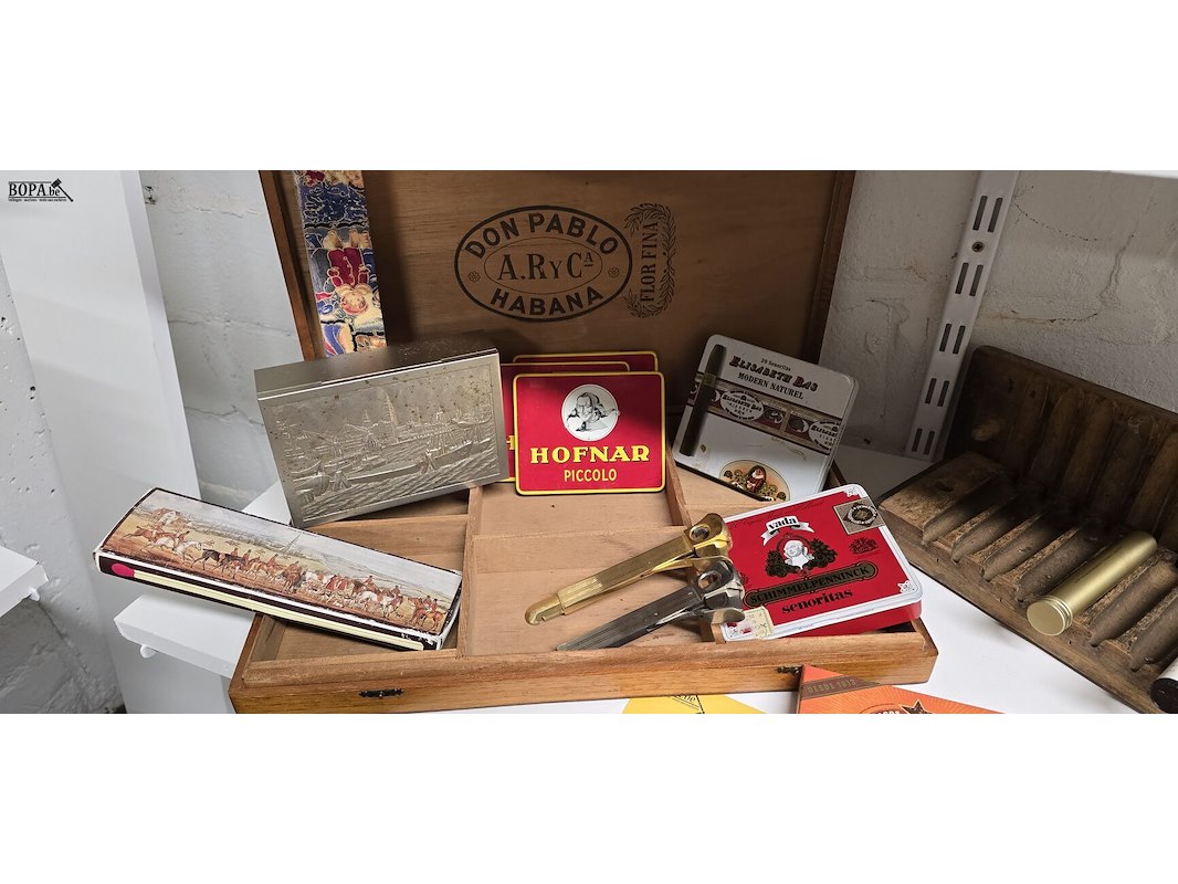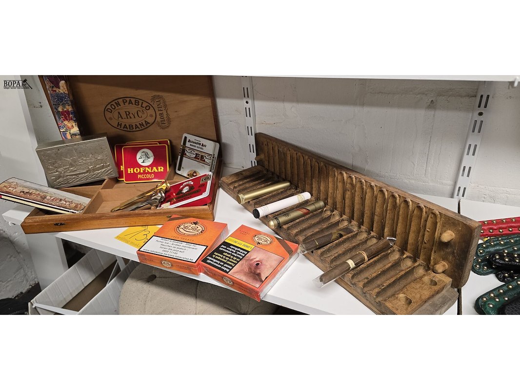 Groot sigaren lot, houten mal met 5 sigaren, diverse lege dozen, volle doos met sigaren, 2 sigarenknippers, grote houten sigarenkist en 2 dozen lange lucifers