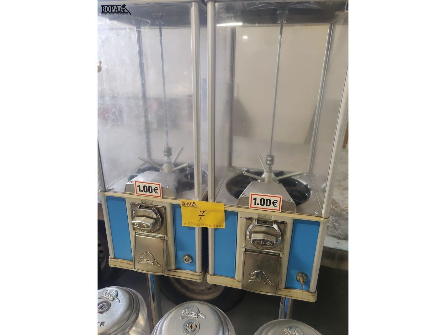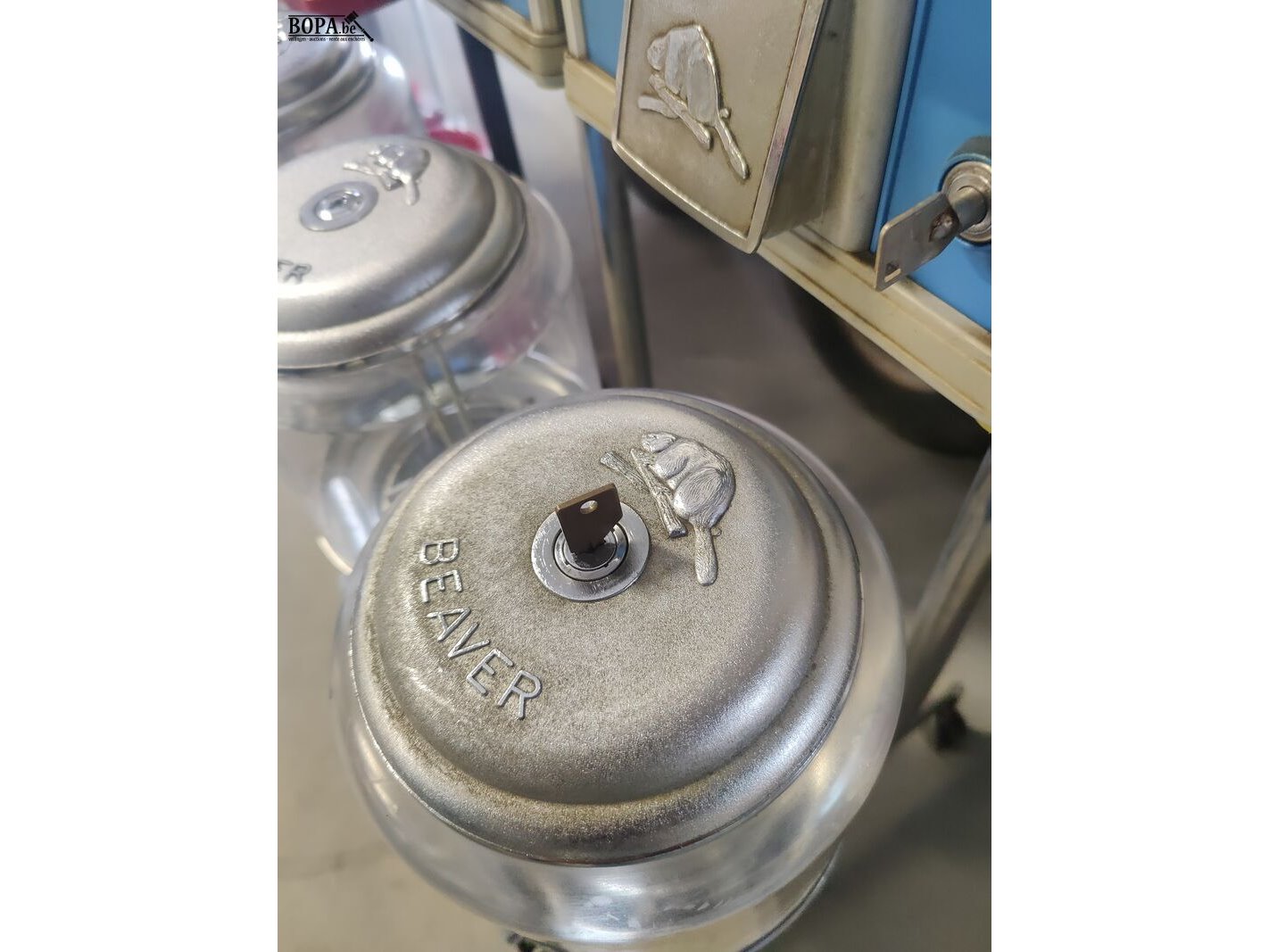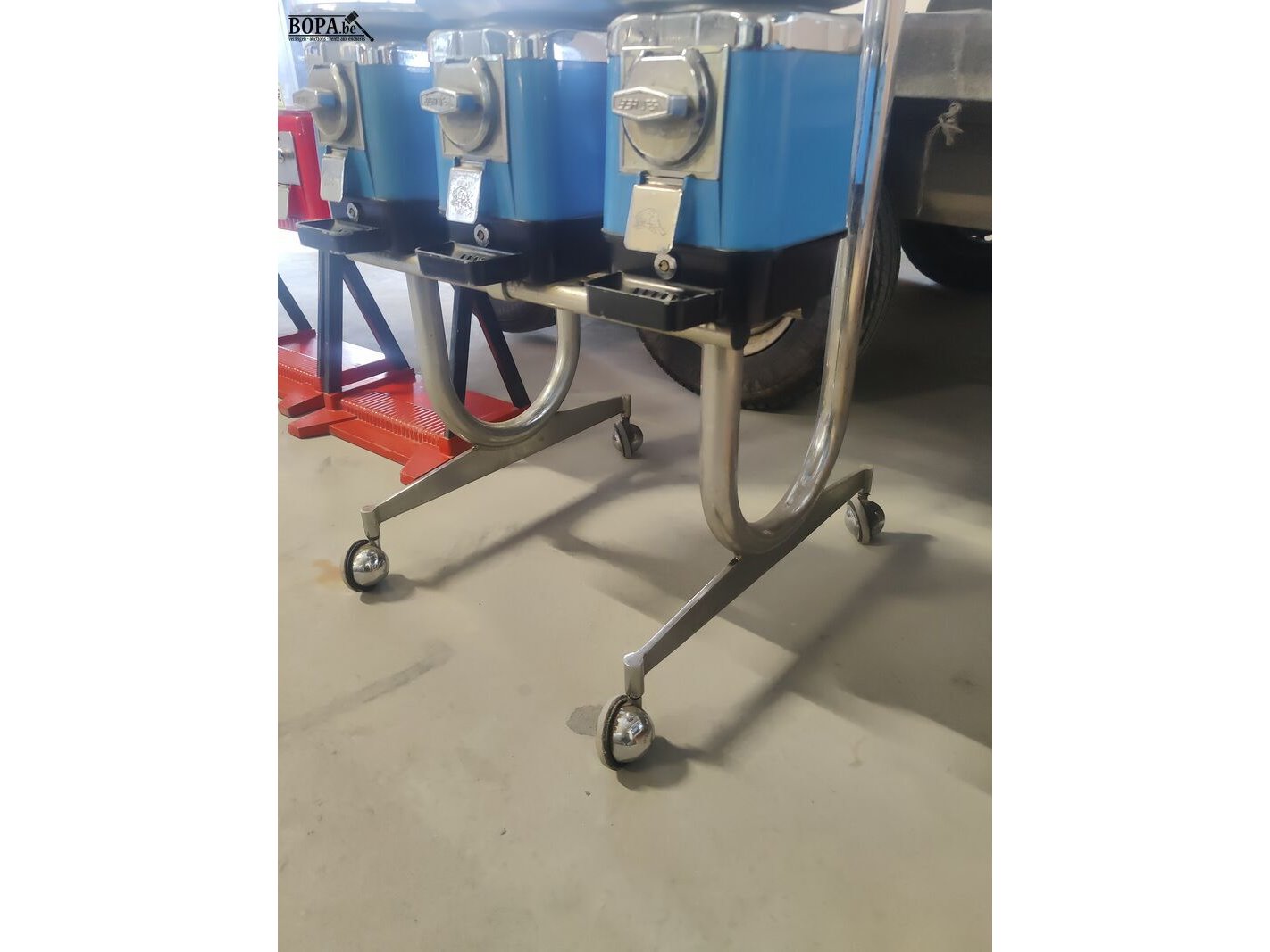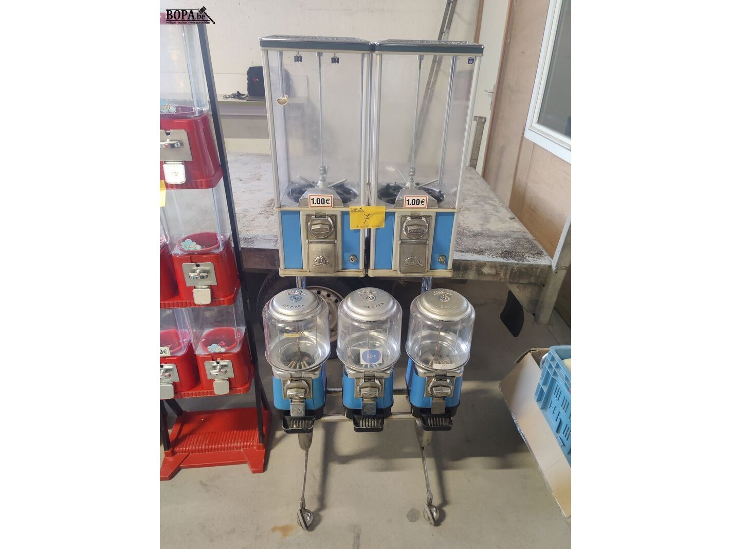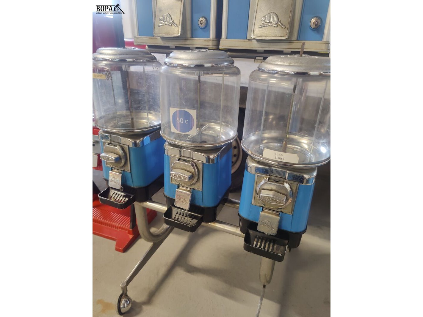 Blauwe Beaver automaat, verrolbare opstelling met 3 rode en twee rechte automaten. Werkend op 1 € en 50 cent.