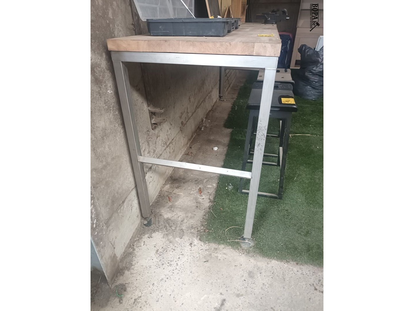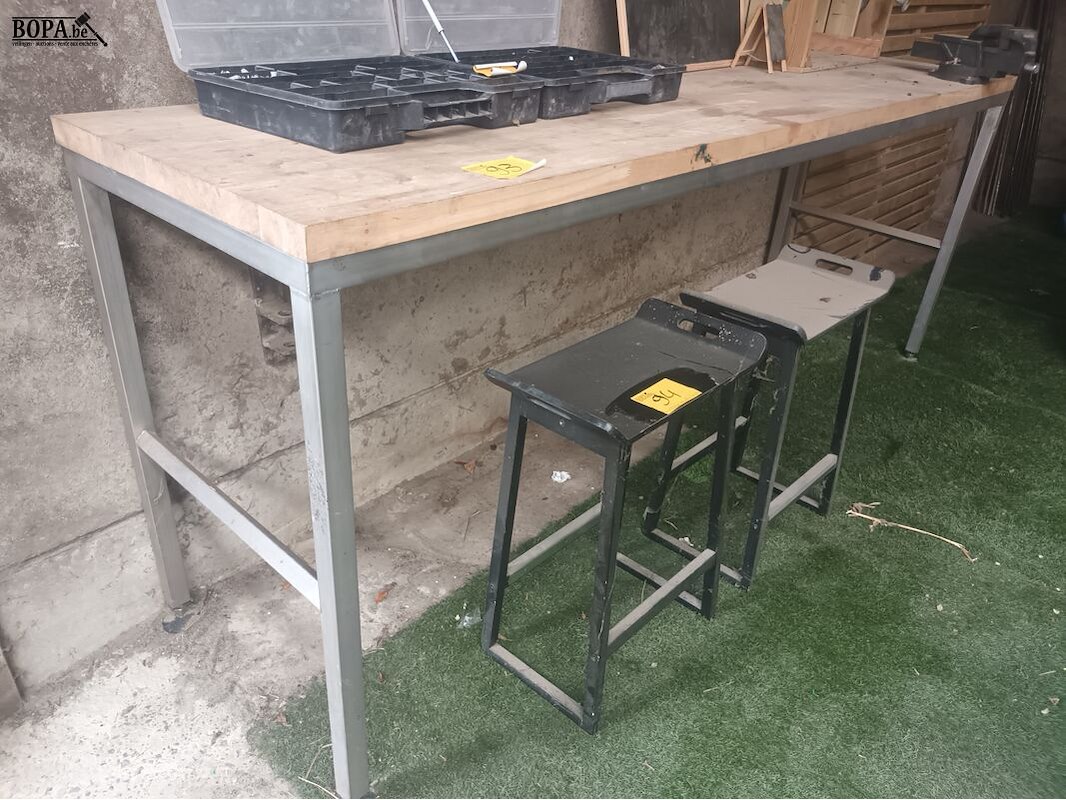 Rechthoekige werktafel met metalen onderstel en houten blad en Kreator bankschroef. 258 x 67 x 101 cm.