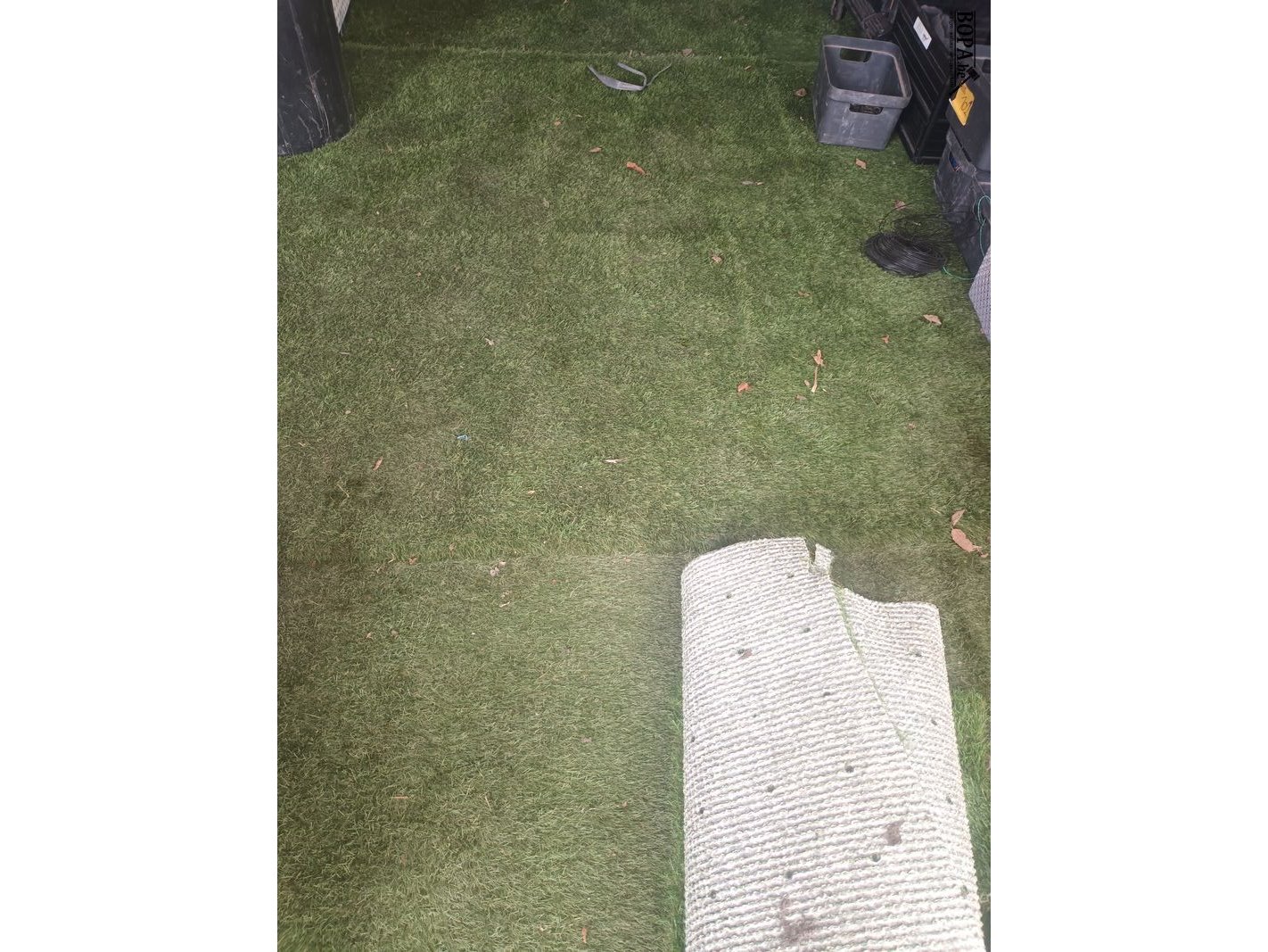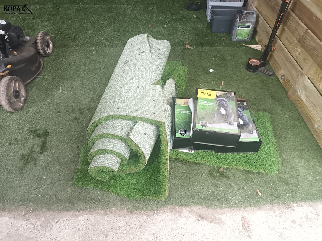Lot kunstgras. Op rol, in dozen en liggend op de grond.