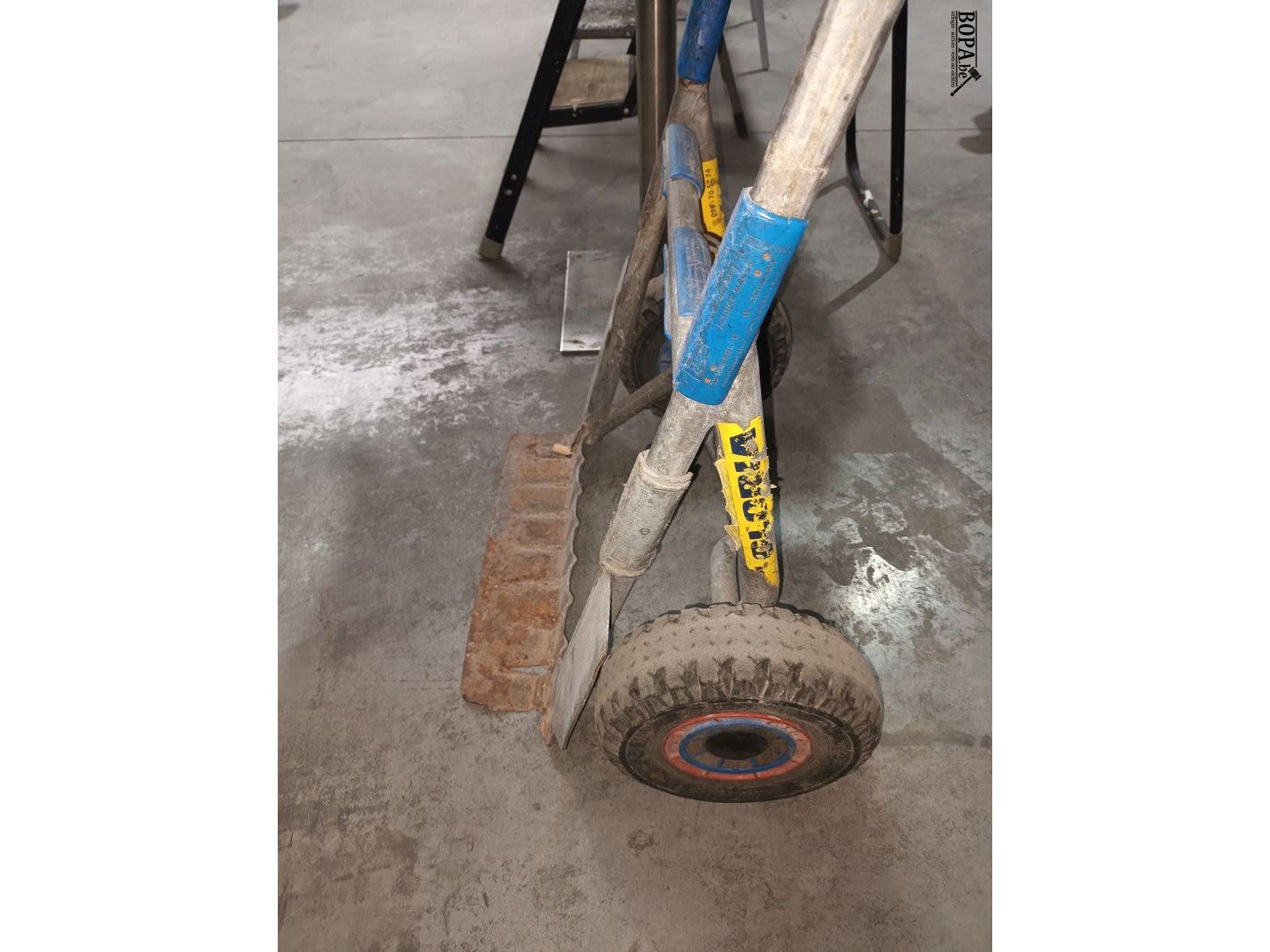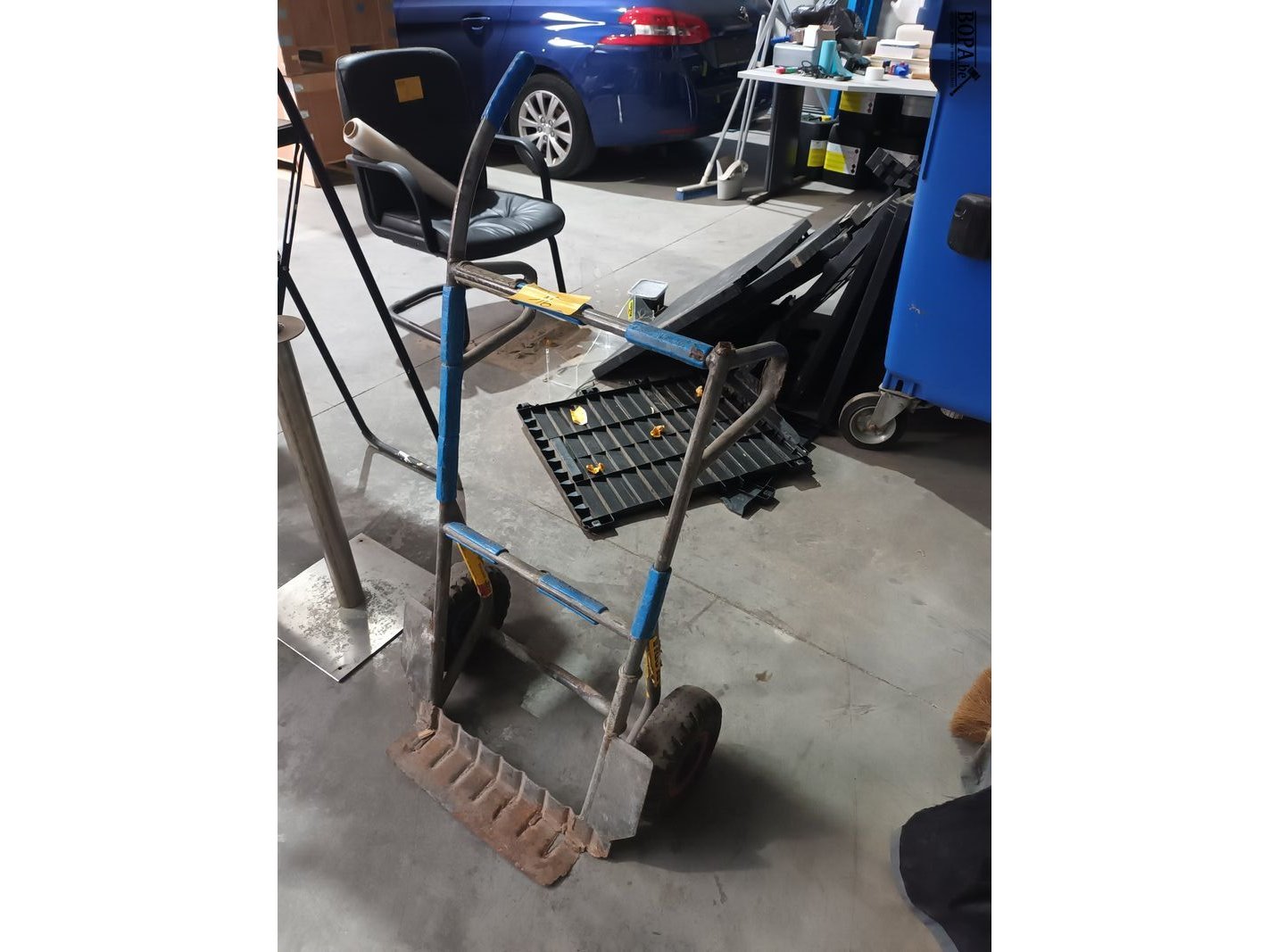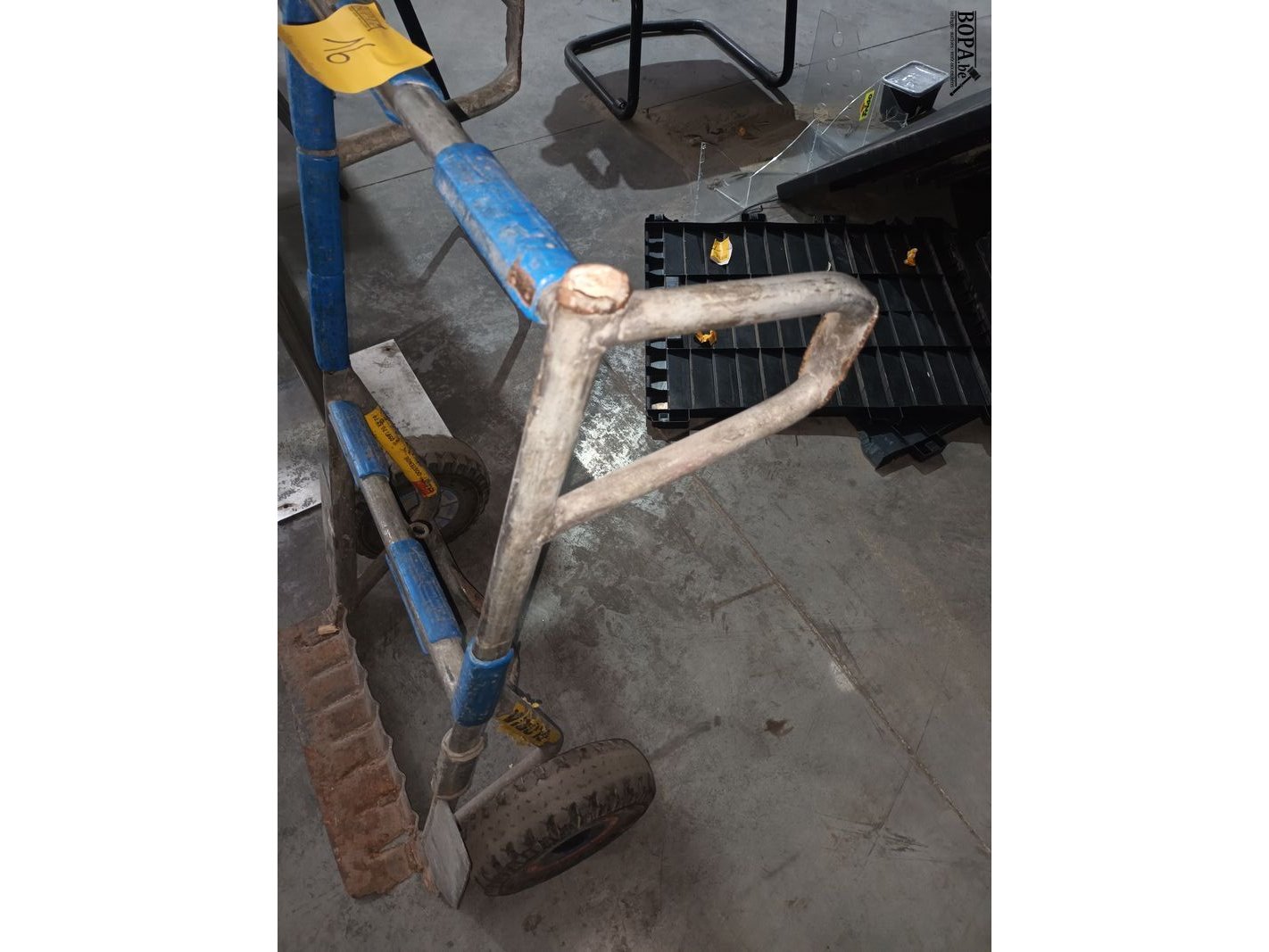 Metalen steekwagen met 1 ontbrekende handgreep.