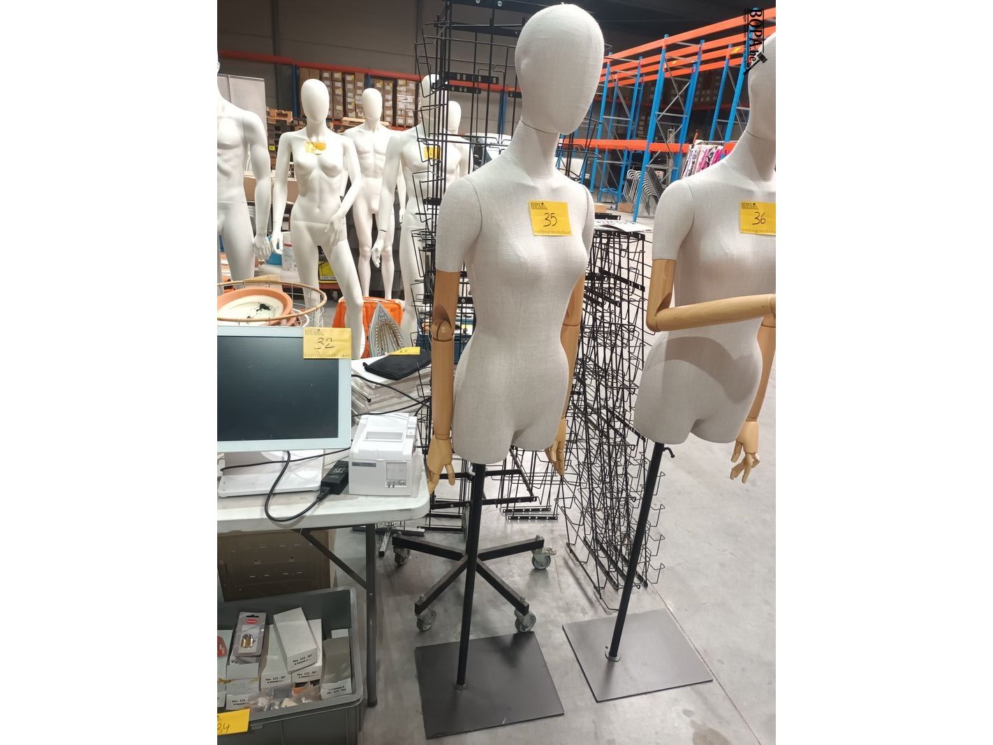 Vrouwelijke etalagepop op metalen voet met plooibare armen en handen. Hoogte 180 cm.