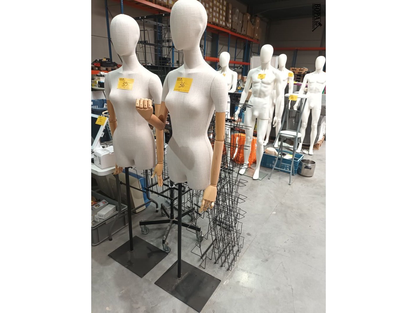 Vrouwelijke etalagepop op metalen voet met plooibare armen en handen. Hoogte 180 cm.
