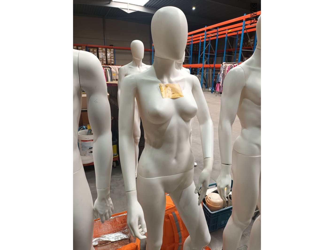 Vrouwelijke etalagepop op glazen voet. Hoogte 175 cm.
