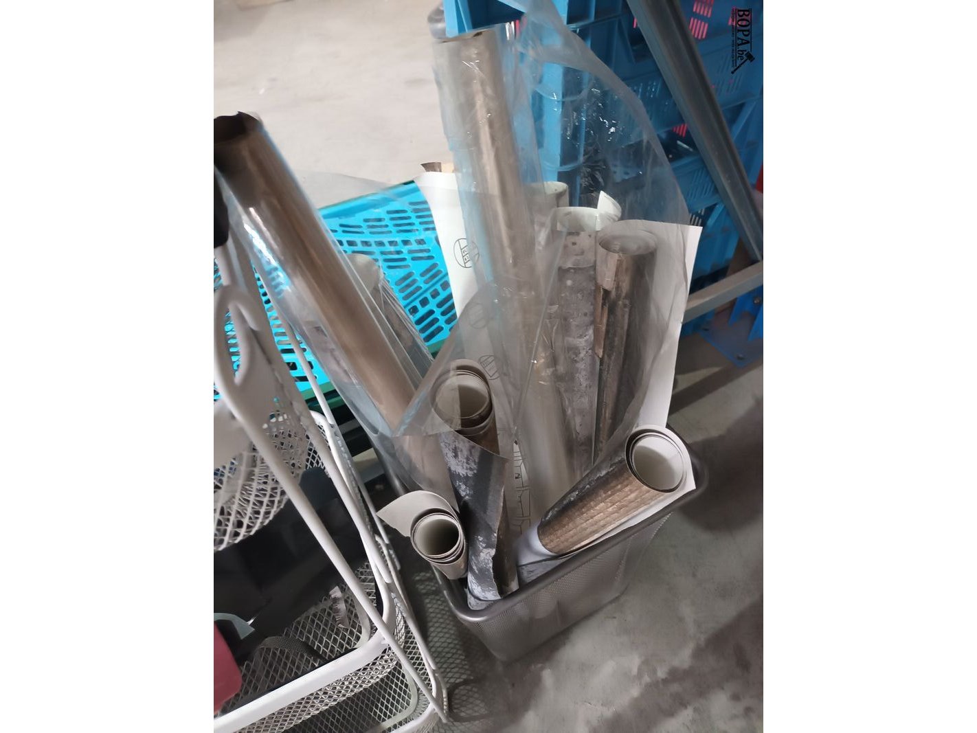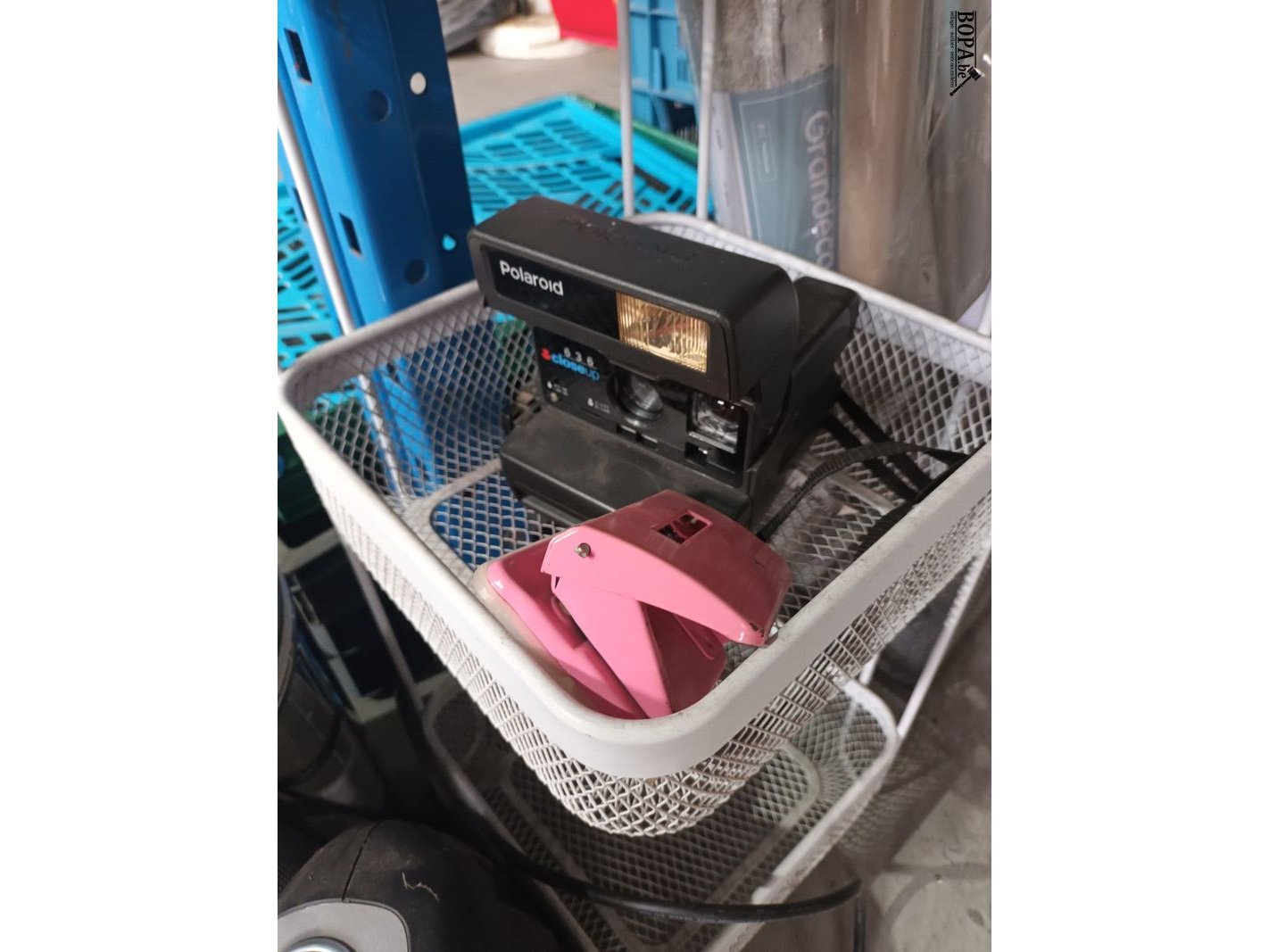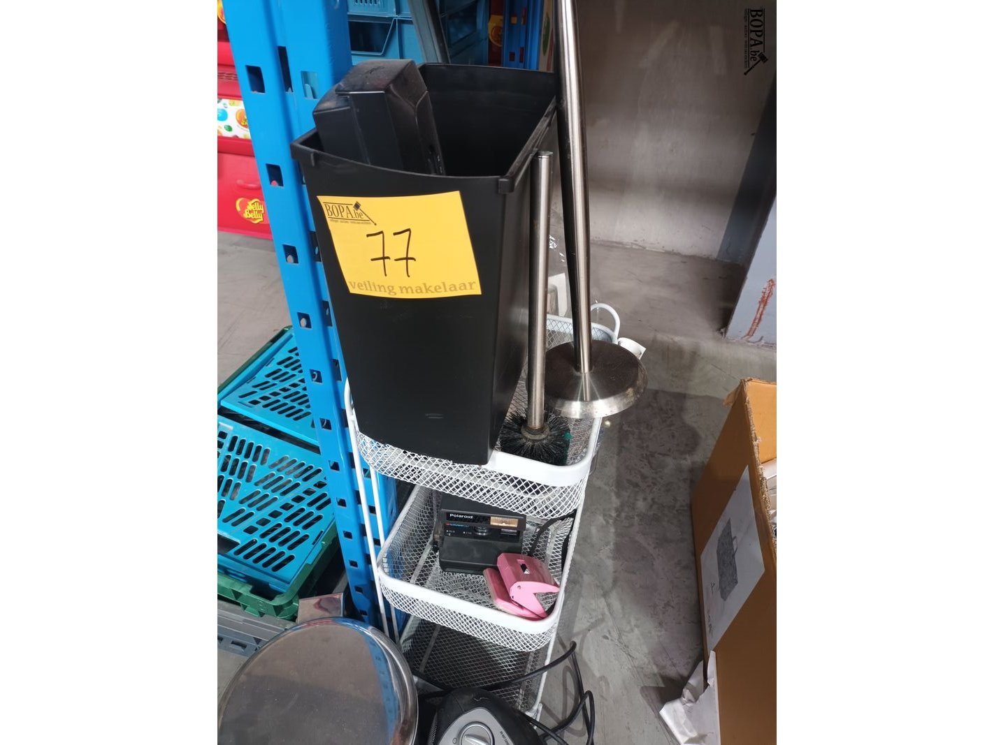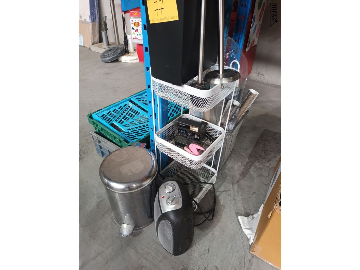 Lot diversen met pedaalemmer, elektrisch verwarmingstoestel, Polaroid toestel, rekje, wc borstel en rollen folie.