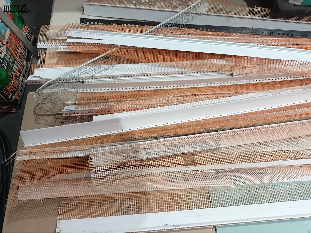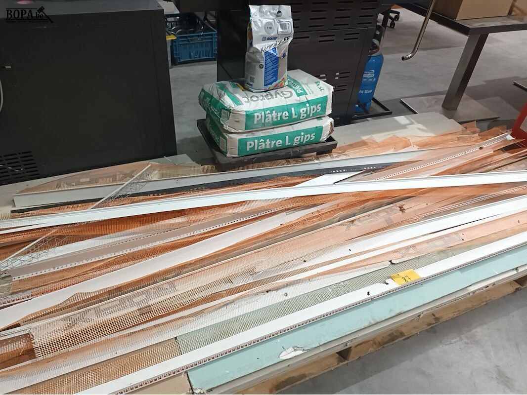 Lot pleisterprofielen, 2 zakken gips, 1 zak cementmortel en een kleine pvc pallet.