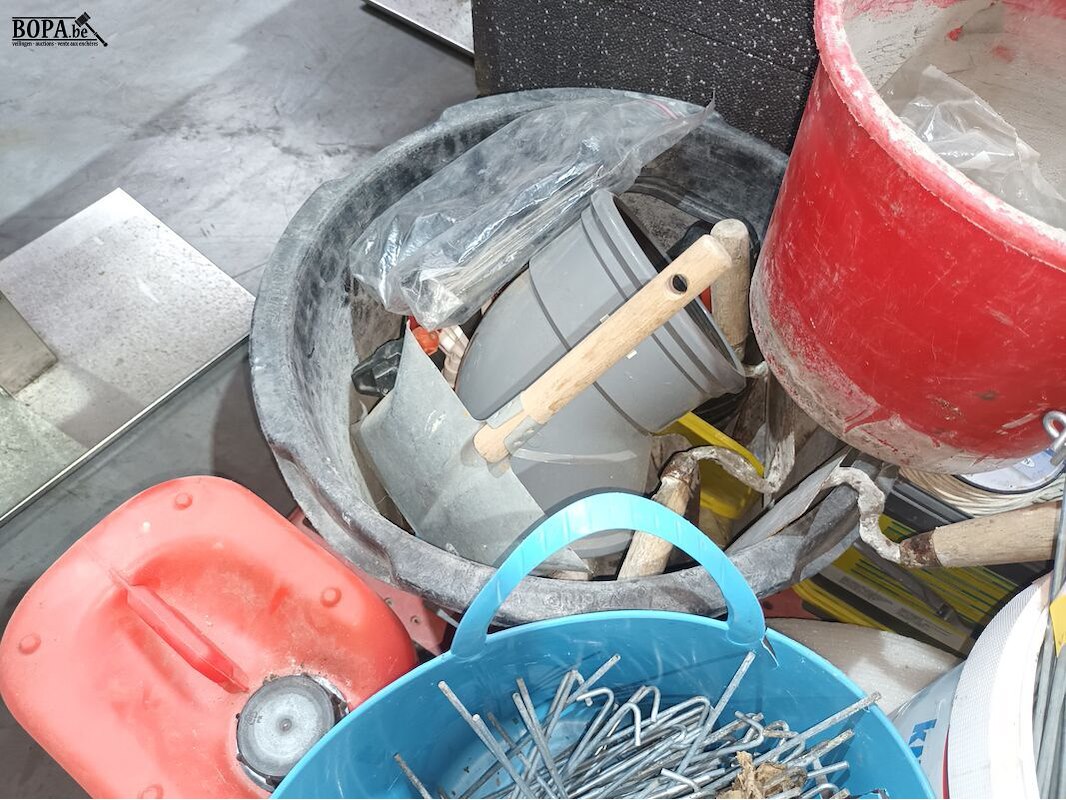 Werkmateriaal zoals emmers, touw, pvc kar en metalen haken.