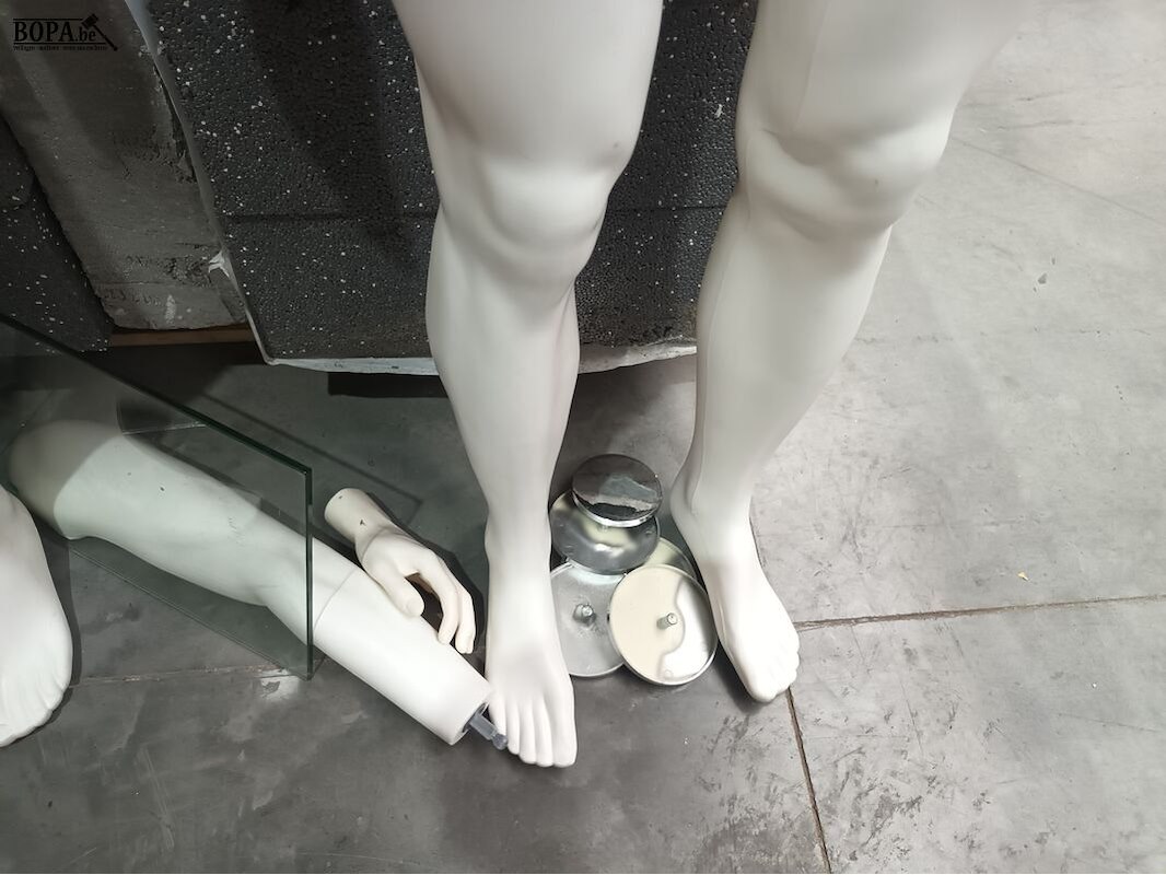 2 mannelijke etalagepoppen waarvan 1 met glazen voet. Hoogte 185 cm.