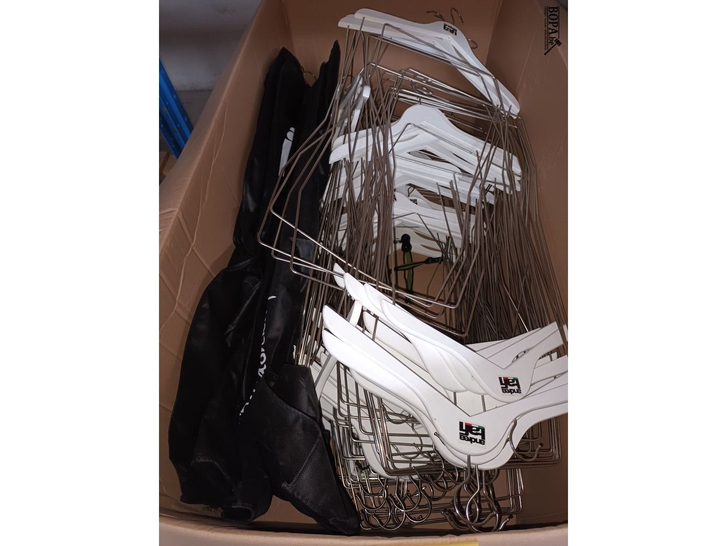 Kledinghangers en kledinghoezen. 1 doos.