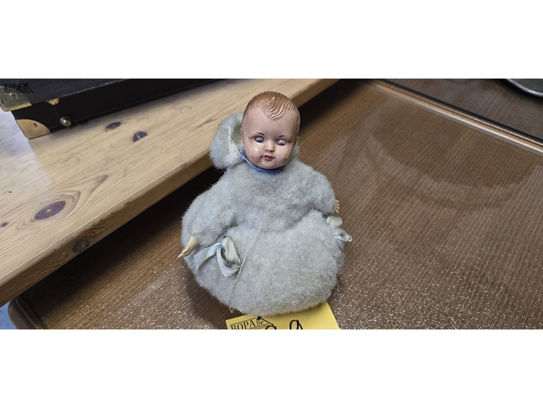 Zeldzame vintage Mechanische babypop jaren 50, met bewegende ogen en originele outfit. Met opwindmechanisme (momenteel geblokkeerd)