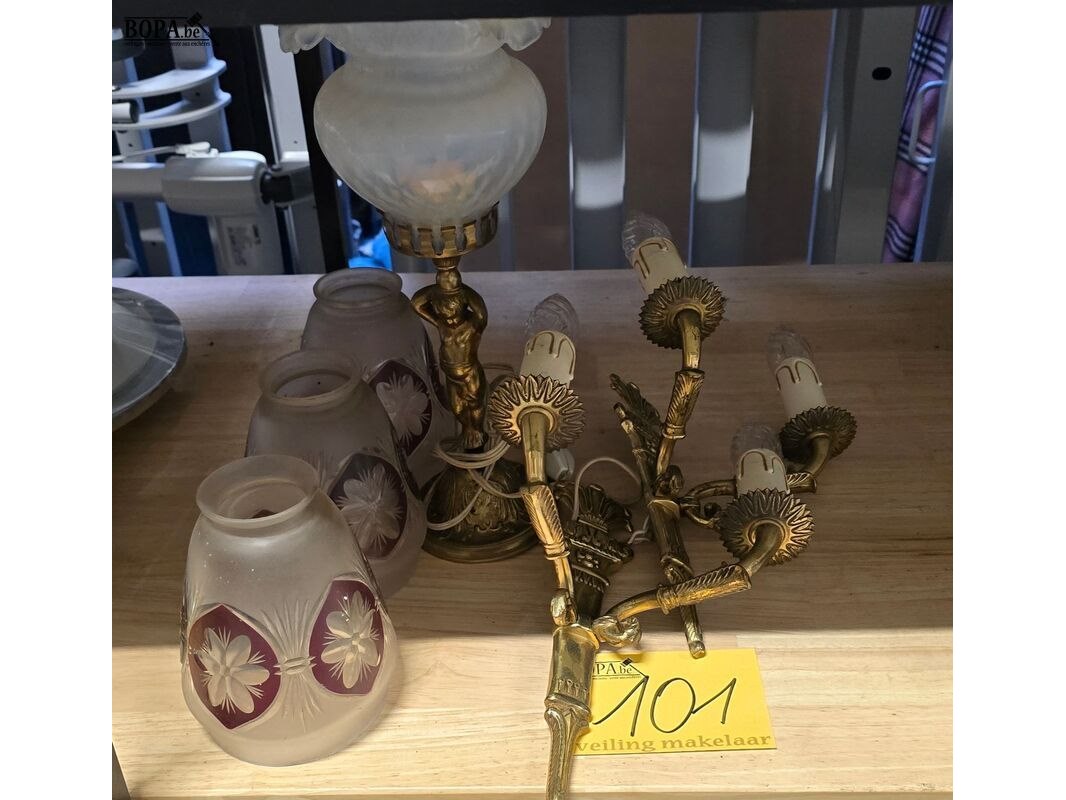 Verlichting set 6 stuks, 2 koperen muur ampliques, tafellamp en 3 glazen lampekappen