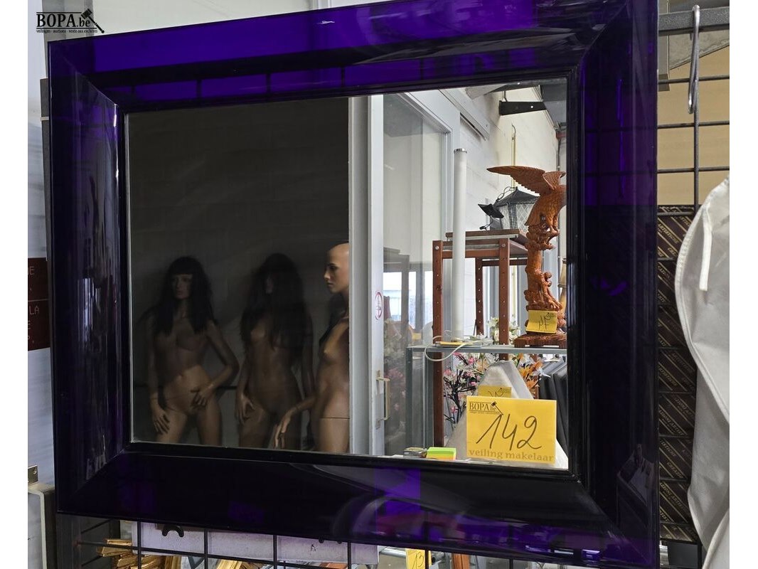 Design spiegel getekend Kartell met doorzichtige paarse kader in polycarbonaat 79 x 65 cm