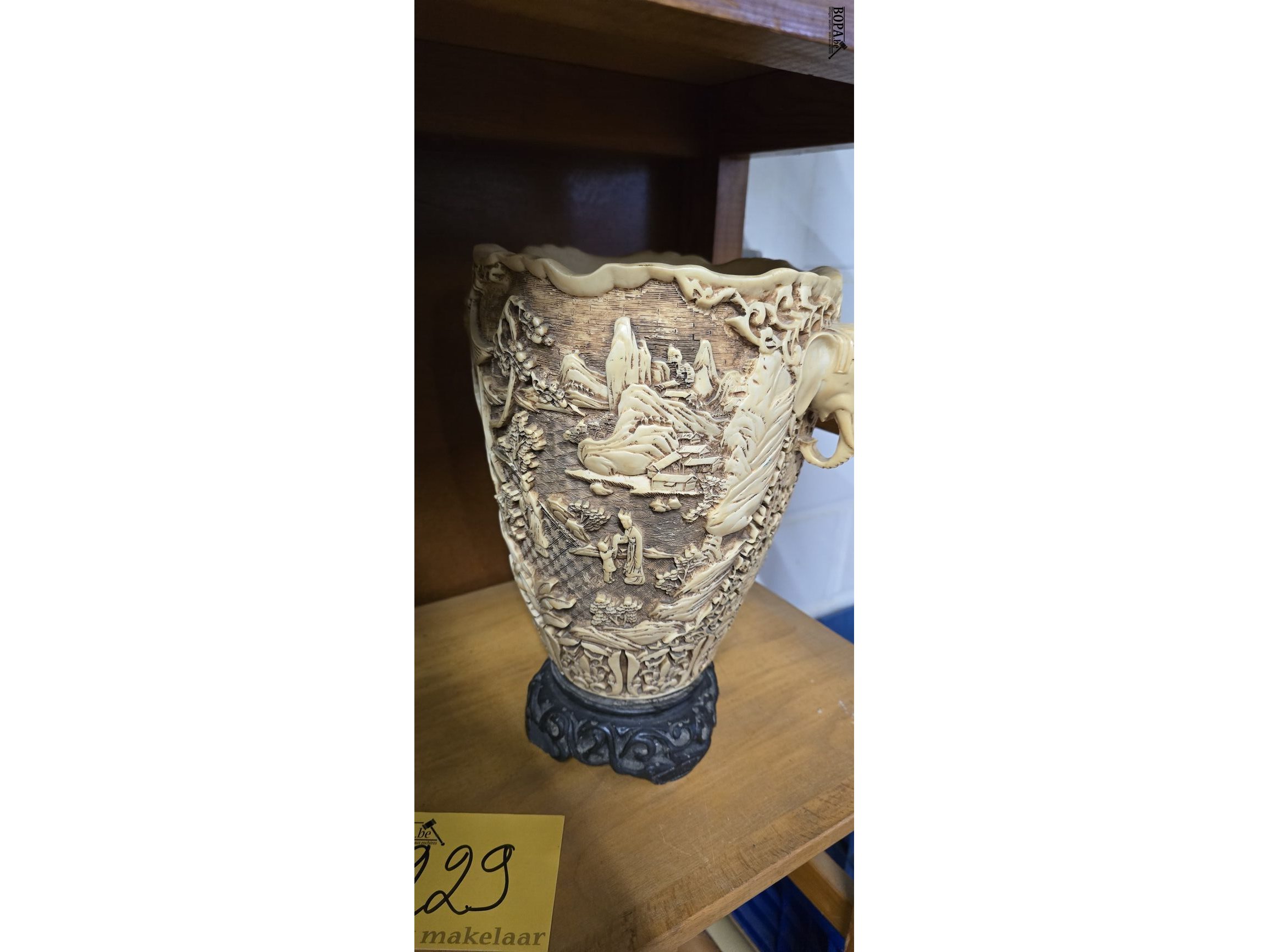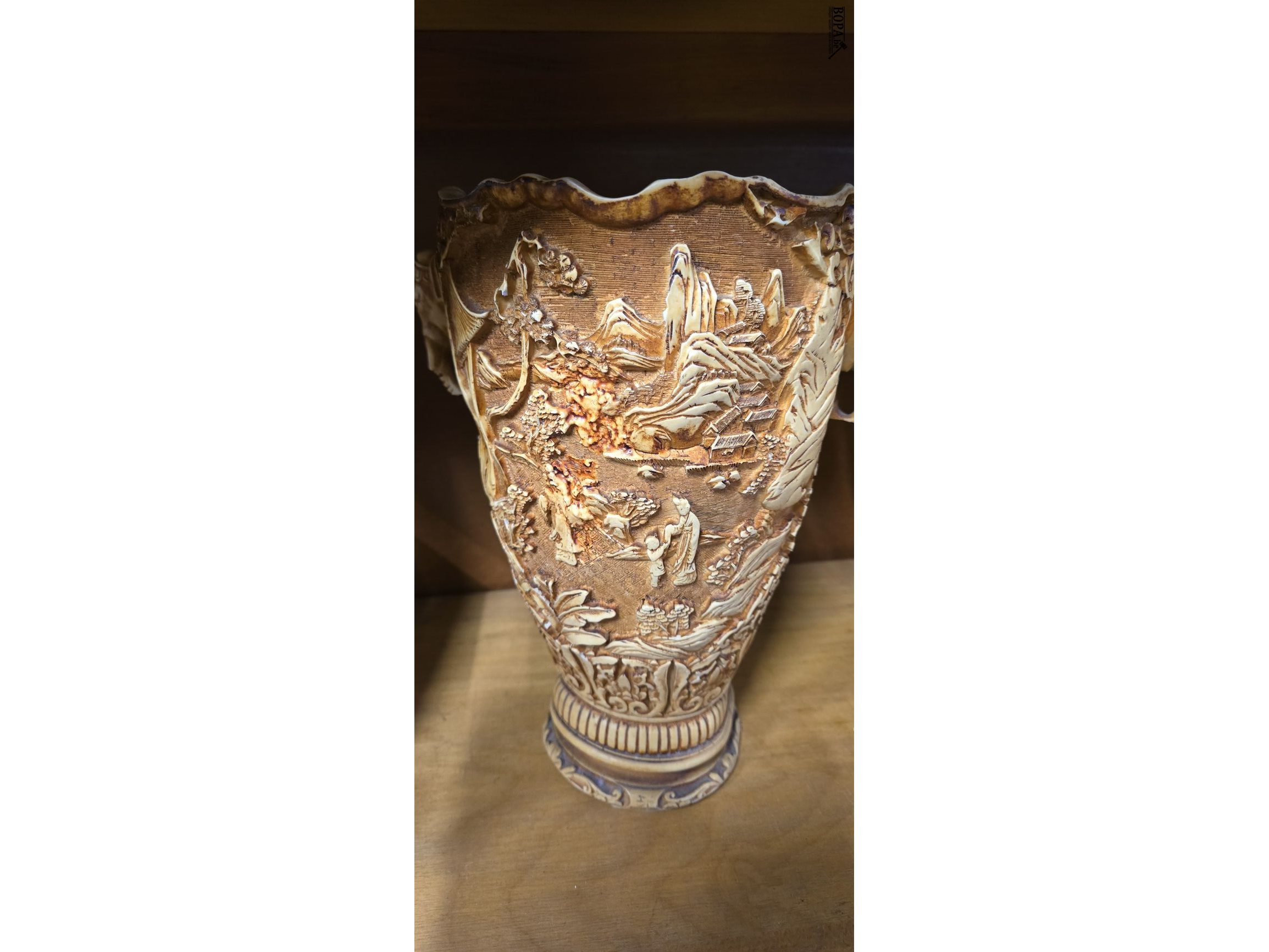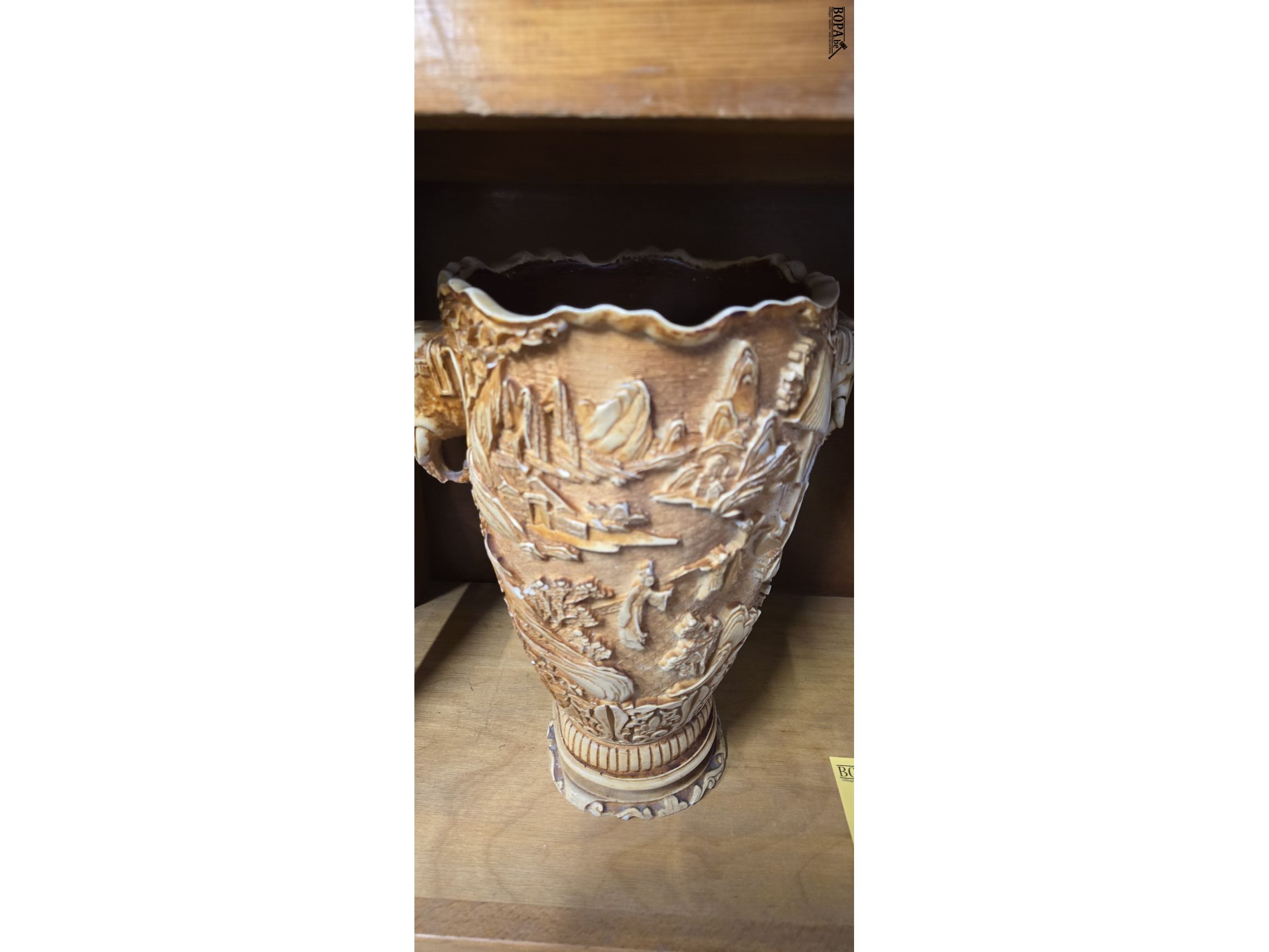 2 Italiaanse resin vazen uit de jaren '60 - '80 gemaakt in resine (hars) met Aziatische landschappen in reliëf en 2 handgrepen in olifantenkoppen