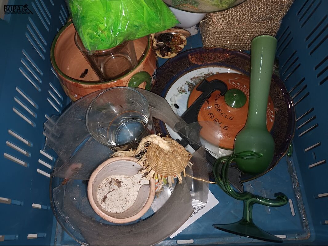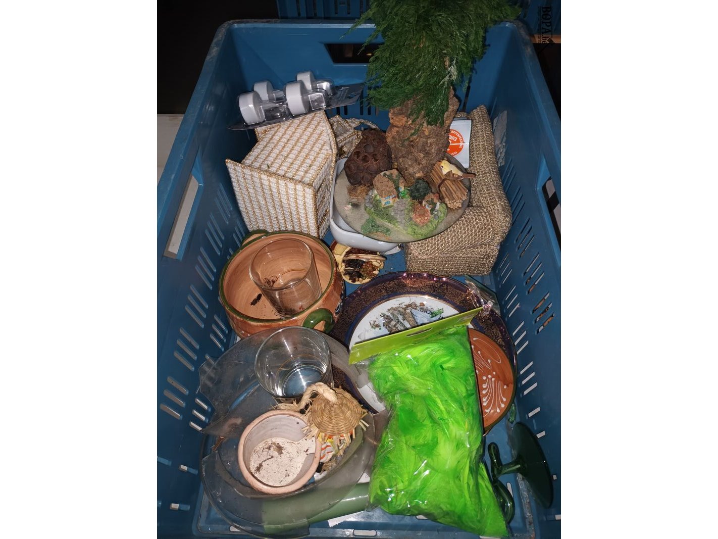 Bak met decoratie en huisraad. Bak niet inbegrepen.