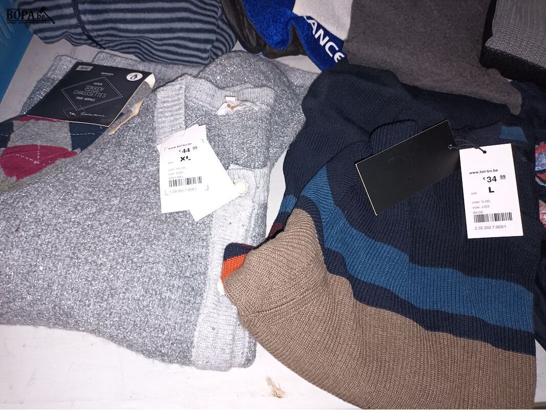Lot kledij voor dames en heren. Meestal nieuw met prijskaartje. Bak niet inbegrepen.