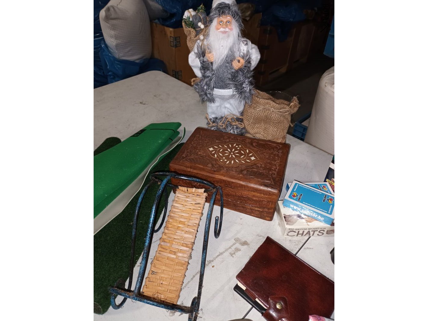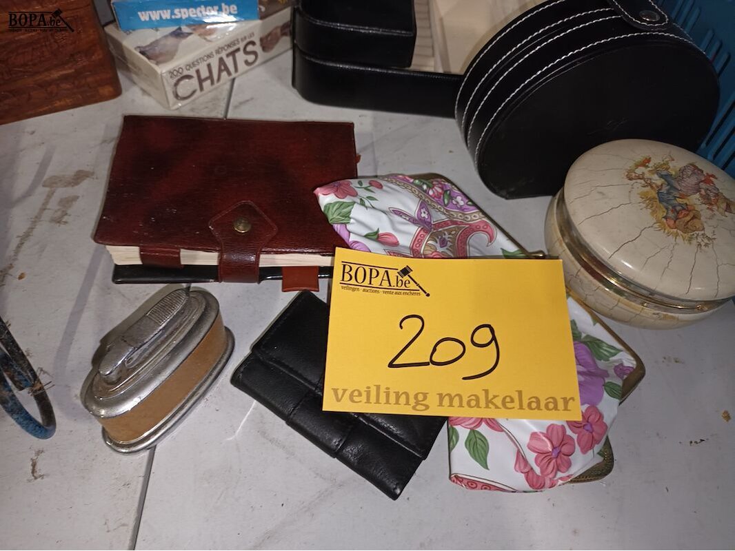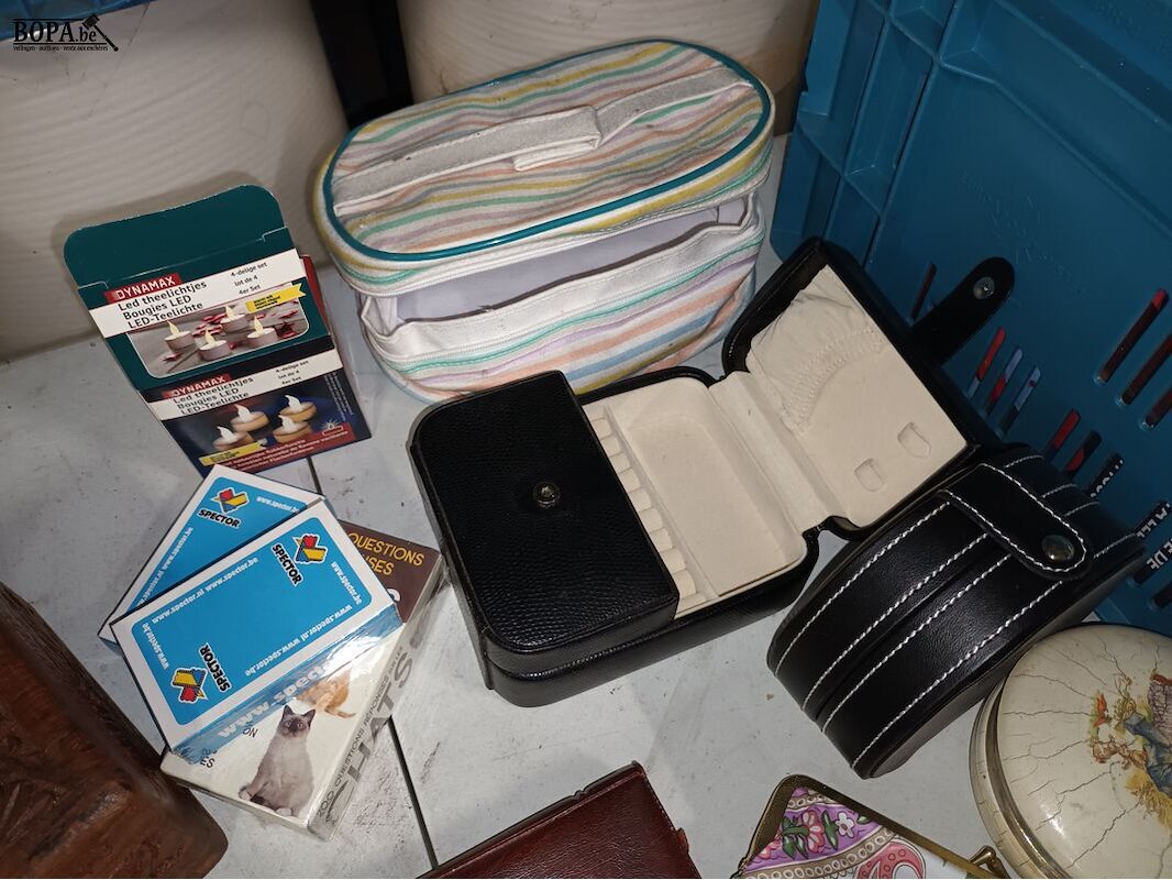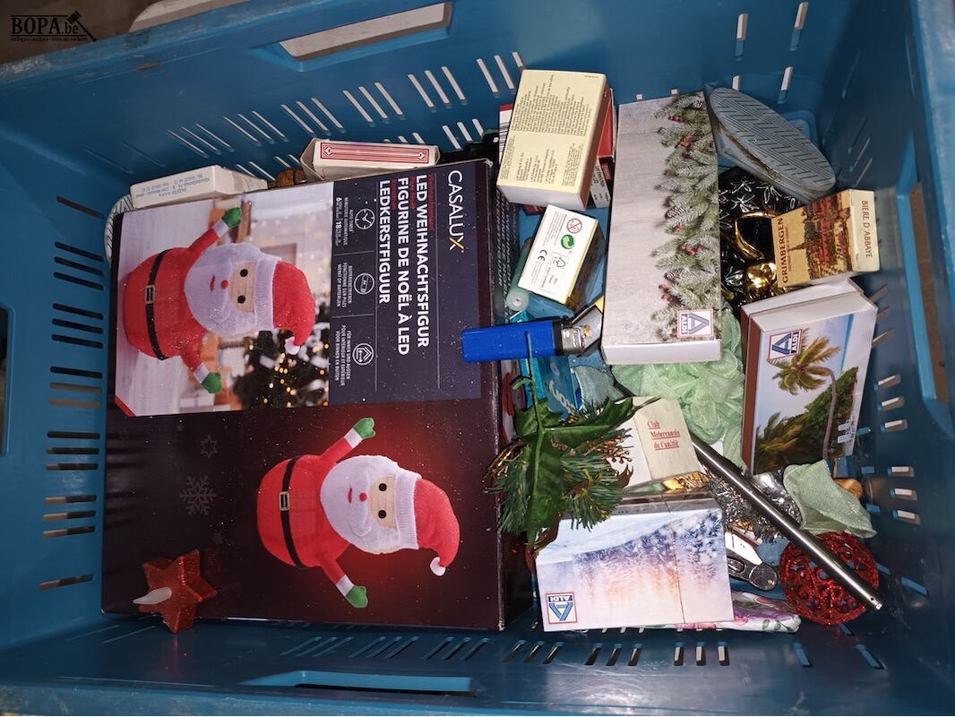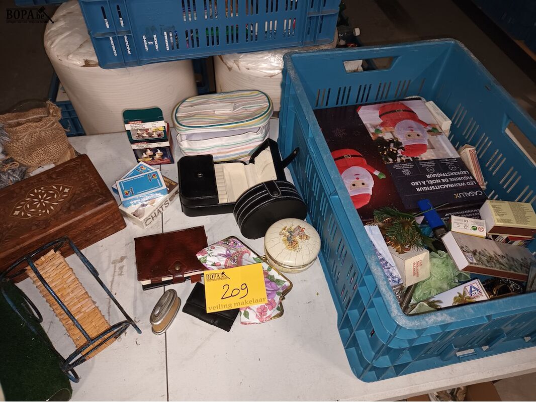1 bak met diversen zoals lucifers, kantoormateriaal, kerstverlichting, speelkaarten, tasjes, kistje, wijnfleshouder, etc. Bak niet inbegrepen.