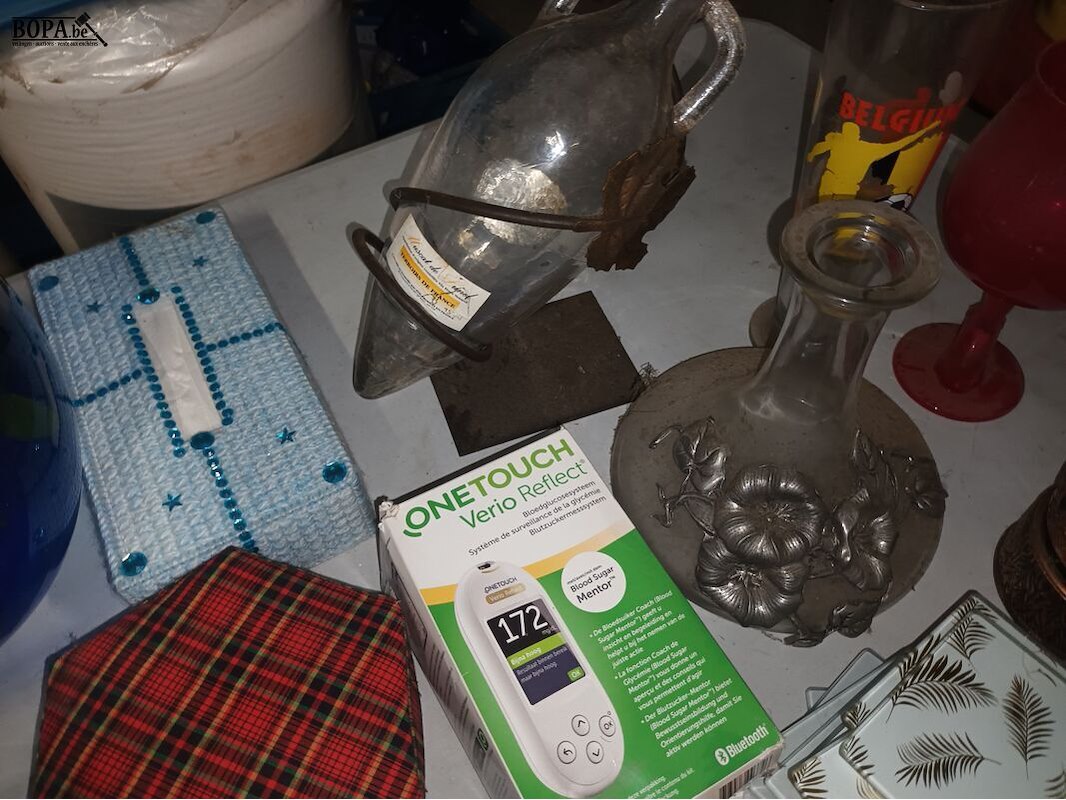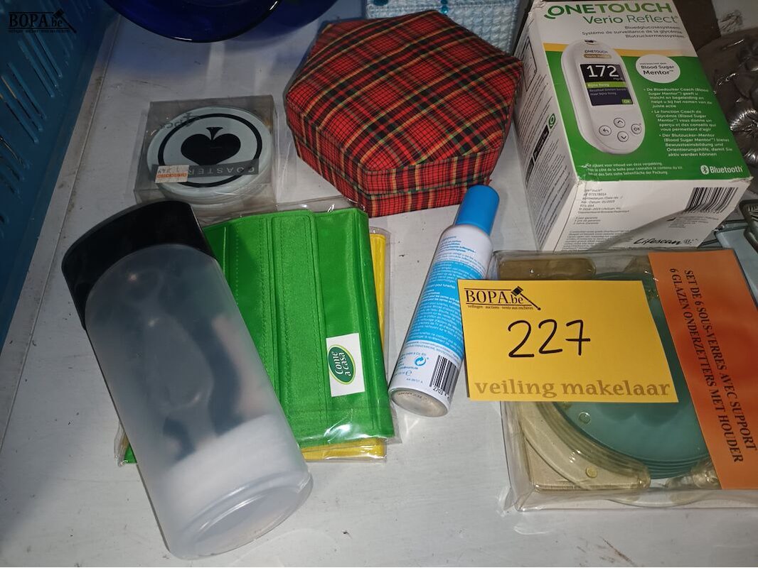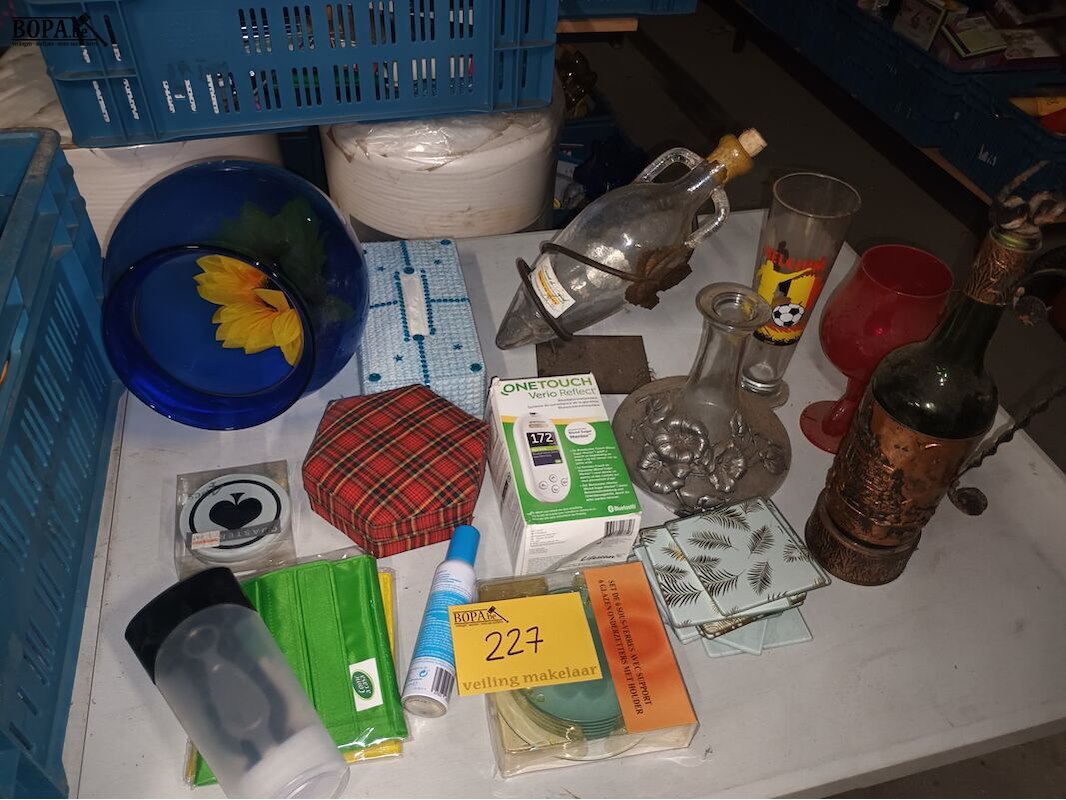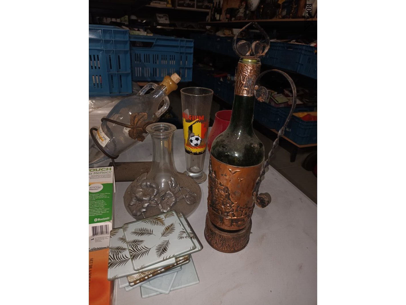 Huisraad. 26 stuks onderzetters, sierflessen, flesopeneners, etc. Bak niet inbegrepen.
