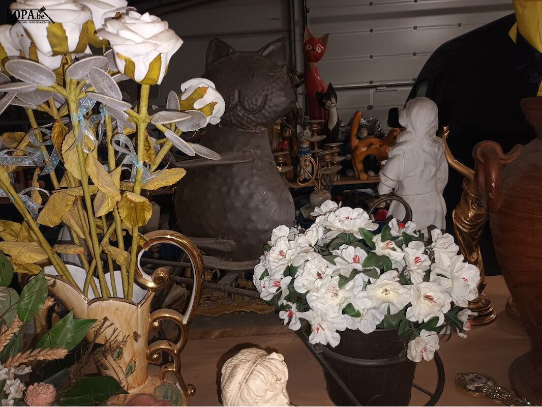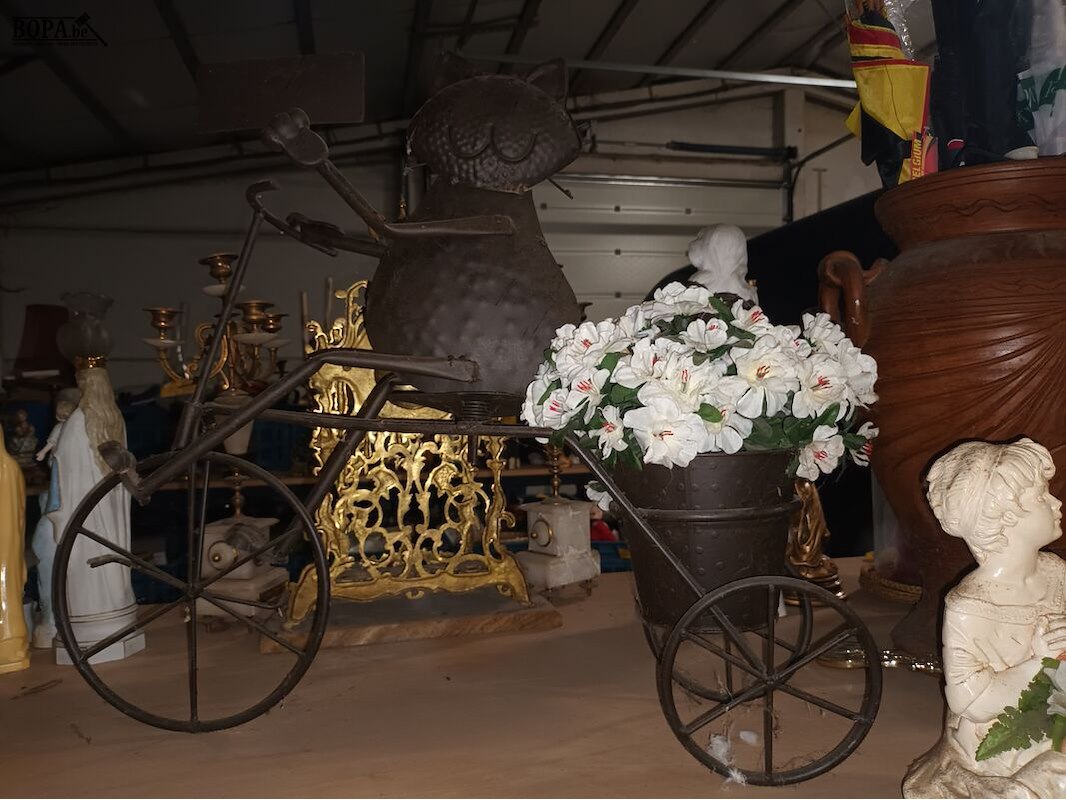 Decoratie. 4 stuks. Metalen kat op fiets, beeldje, vaas en sierbloemen.