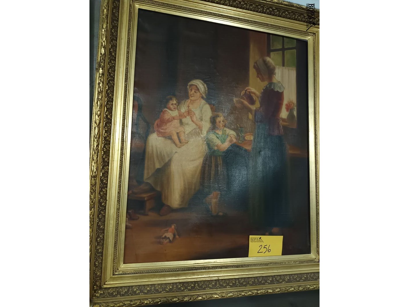Schilderij vrouwen en kinderen in vergulde lijst. 70 x 87 cm.