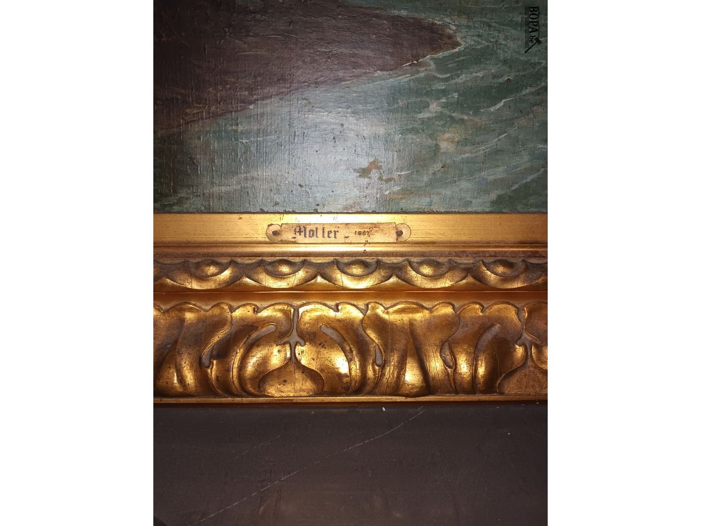 Schilderij waterval in vergulde lijst. 110 x 130 cm.